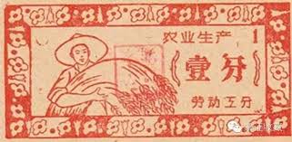 노동 = 점수: 농민이 인민공사에서 수행한 농업 노동이나 공공 작업(건설 등)을 시간과 강도에 따라 점수(공분)로 매겼습니다.