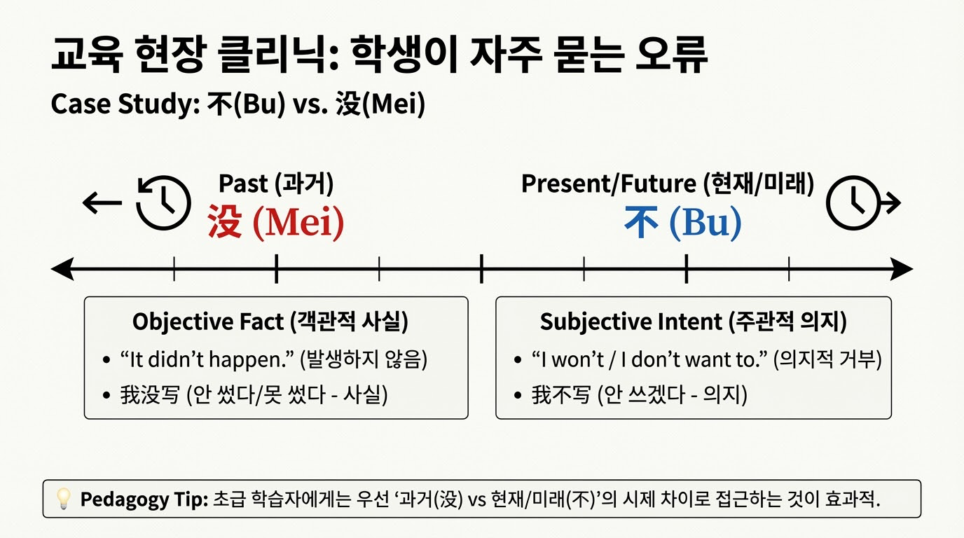 - '不'와 '没'의 차이점: 첫째, 시간적 차이가 있습니다. '不'는 주로 현재나 미래의 행위를 부정할 때 사용하고("我明天不去"), '没'는 주로 과거에 발생한 행위를 부정할 때 사용합니다("我昨天没去"). 둘째, 주관/객관적 차이가 있습니다. '不'는 주관적인 의지나 생각을 나타내는 경우가 많고("我不写作业"), '没'는 객관적인 사실이나 상황을 묘사하는 경우가 많습니다("我(因为太忙)没写作业").