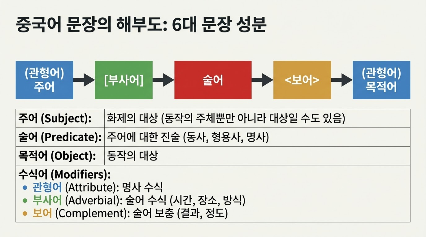 | 보어 (补语) | 술어(동사, 형용사) 뒤에 위치하여 동작이나 상태의 결과, 정도, 가능성, 방향, 시간, 횟수 등을 보충 설명하는 문장 성분. |