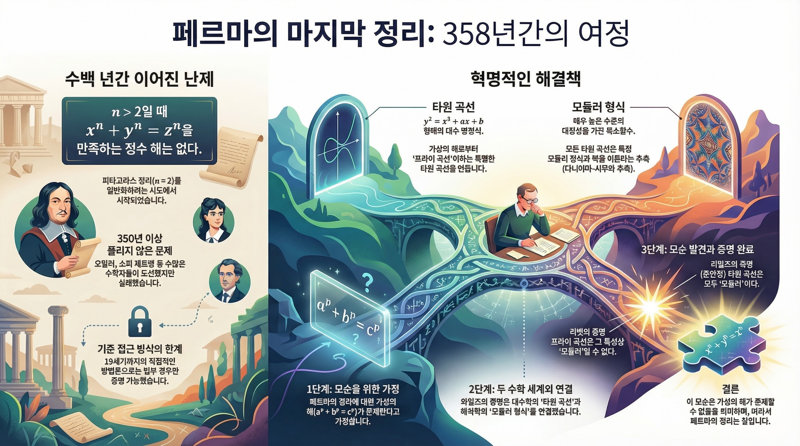 [패널]: 非常好的比喻!這個猜想就像一座橋,連接了兩個看似毫無關係的數學世界:代數(也就是橢圓曲線)和分析(也就是模形式)。 (Fēicháng hǎo de bǐyù! Zhège cāixiǎng jiù xiàng yízù qiáo, liánjiē le liǎnggè kànsì háowú guānxi de shùxué shìjiè: dàishù (yějiùshì tuǒyuán qūxiàn) hé fēnxī (yějiùshì mó xíngshì).) 멋진 비유입니다! 이 가설은 전혀 상관없어 보이던 '대수학(타원 곡선)'과 '해석학(모듈 형태)'이라는 두 수학 세계를 잇는 다리 역할을 했습니다.