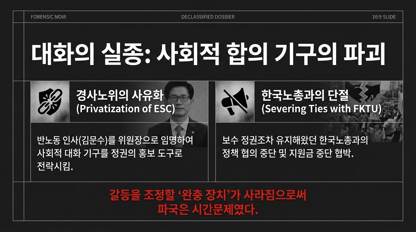 정부는 노조를 '잠재적 범죄자' 또는 '기득권 이익집단'으로 폄훼하면서도, 동시에 노동 개혁을 위해 그들을 대화 테이블로 끌어들여야 한다는 전략적 자기모순에 빠져 있다. 김문수 위원장의 임명은 사회적 대화 기구의 중립성을 훼손했고, 이는 온건 노선인 한국노총조차 등을 돌리게 하는 결과를 낳았다.