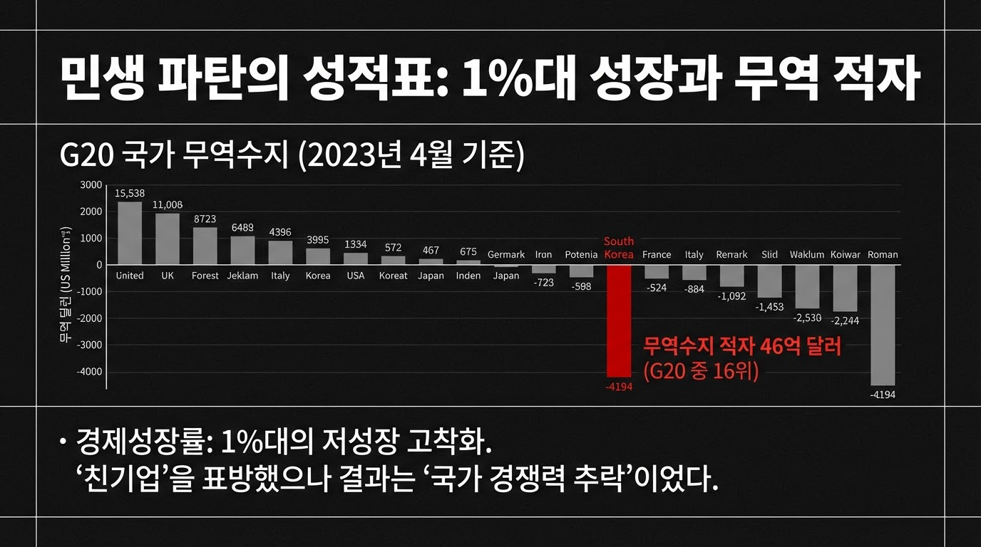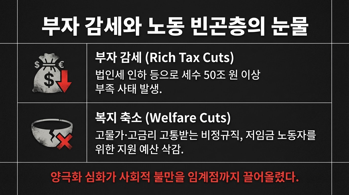 G20 국가 무역수지 데이터에 따르면, 한국은 2023년 4월 기준 46억 2천만 달러의 적자를 기록하며 G20 중 16위로 추락했다. 1%대 저성장과 고물가가 지속되는 상황에서 정부의 일방적인 친기업 정책은 '노동빈곤층(Labor Poverty)' 양산과 사회적 갈등 비용 증폭이라는 거시적 위험을 내포하고 있다. 특히 세수 감소로 인한 복지 예산 제약은 비정규직 및 저임금 노동자 등 취약 계층의 위기를 심화시키고 있다.