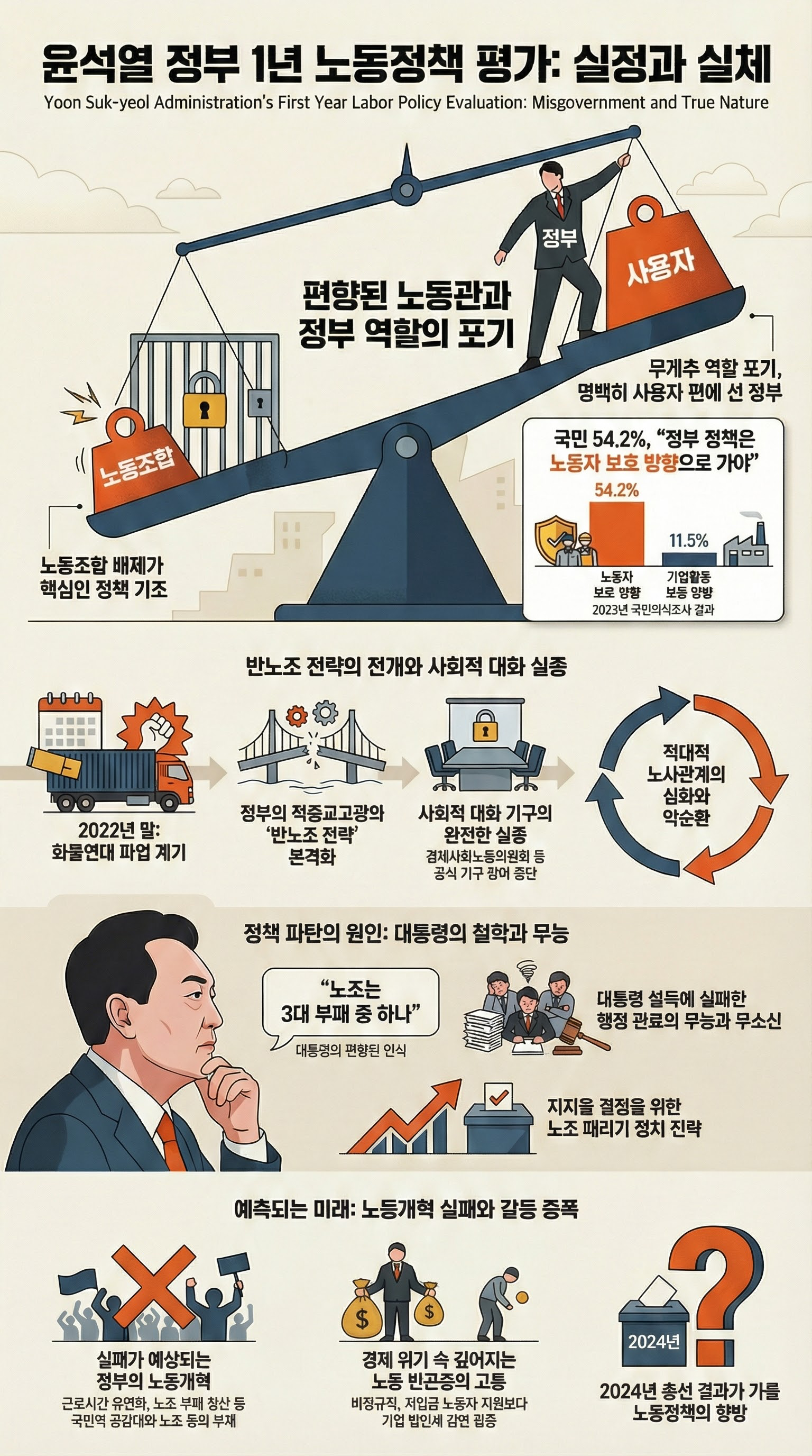 윤석열 정부 출범 이후 지난 1년의 노사관계는 '정부의 공정한 중재자 역할 상실'과 그로 인한 '힘의 불균형의 극단적 심화'로 규정할 수 있다. 노사관계에서 정부의 존재 이유는 공공부문의 사용자로서 모범적 고용 모델을 제시하고, 민간부문에서는 노사 간 힘의 격차를 조정하여 지속 가능한 국가 공동체를 유지하는 데 있다.