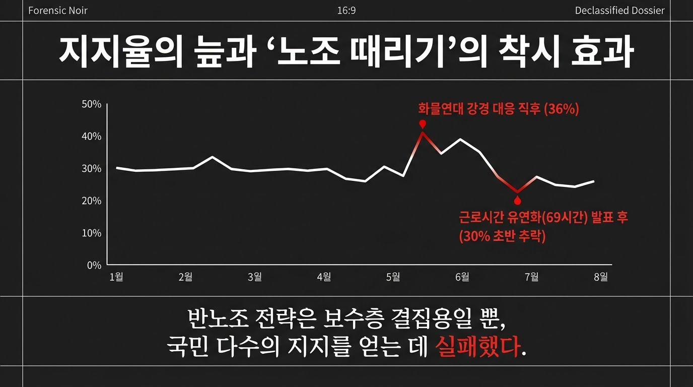 정치 공학적으로 볼 때, '노조 때리기'는 보수층 결집을 위한 매력적인 카드였습니다. 실제로 화물연대 파업에 강경 대응한 직후 윤석열 대통령의 지지율은 30%대 초반에서 36%까지 반등하며 효과를 거두는 듯 보였지요.