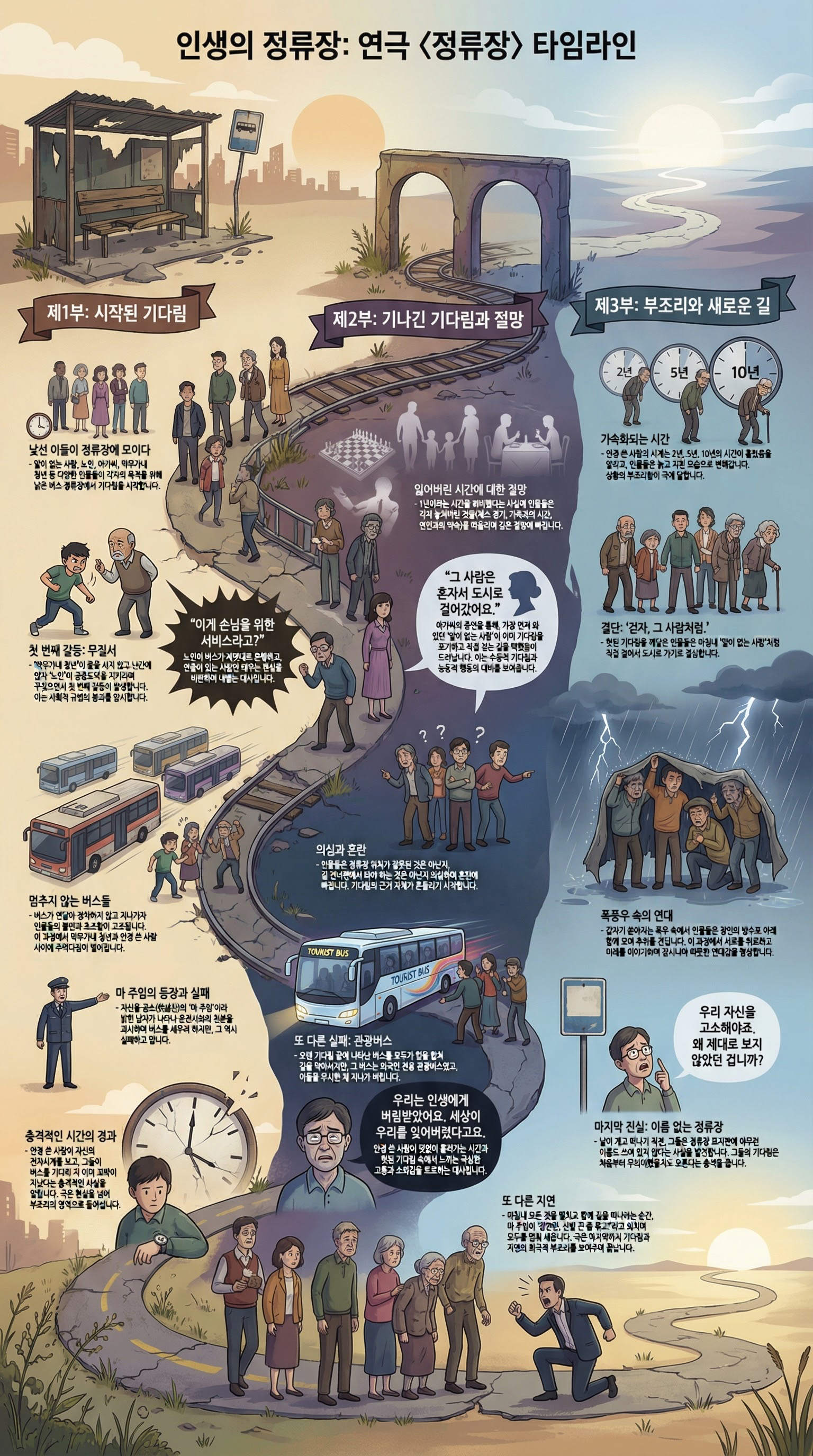 [패널]: 但緊接著就是全劇最冷酷、也是最精彩的一筆:他們無意中發現,那個他們等了十年的站牌……(Dàn jǐnjiēzhe jiùshì quánjù zuì lěngkù, yěshì zuì jīngcǎi de yìbǐ: tāmen wúyì zhōng fāxiàn, nàge tāmen děngle shínián de zhànpái……) 하지만 바로 뒤이어 가장 냉혹하고도 탁월한 반전이 등장합니다. 10년을 지켰던 그 표지판을 우연히 살피게 되는데...