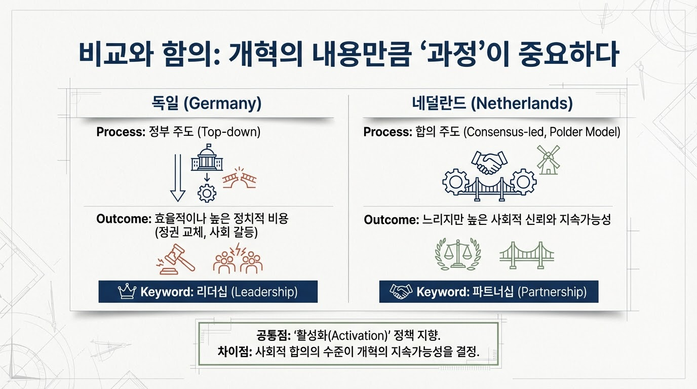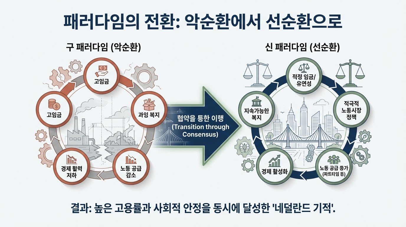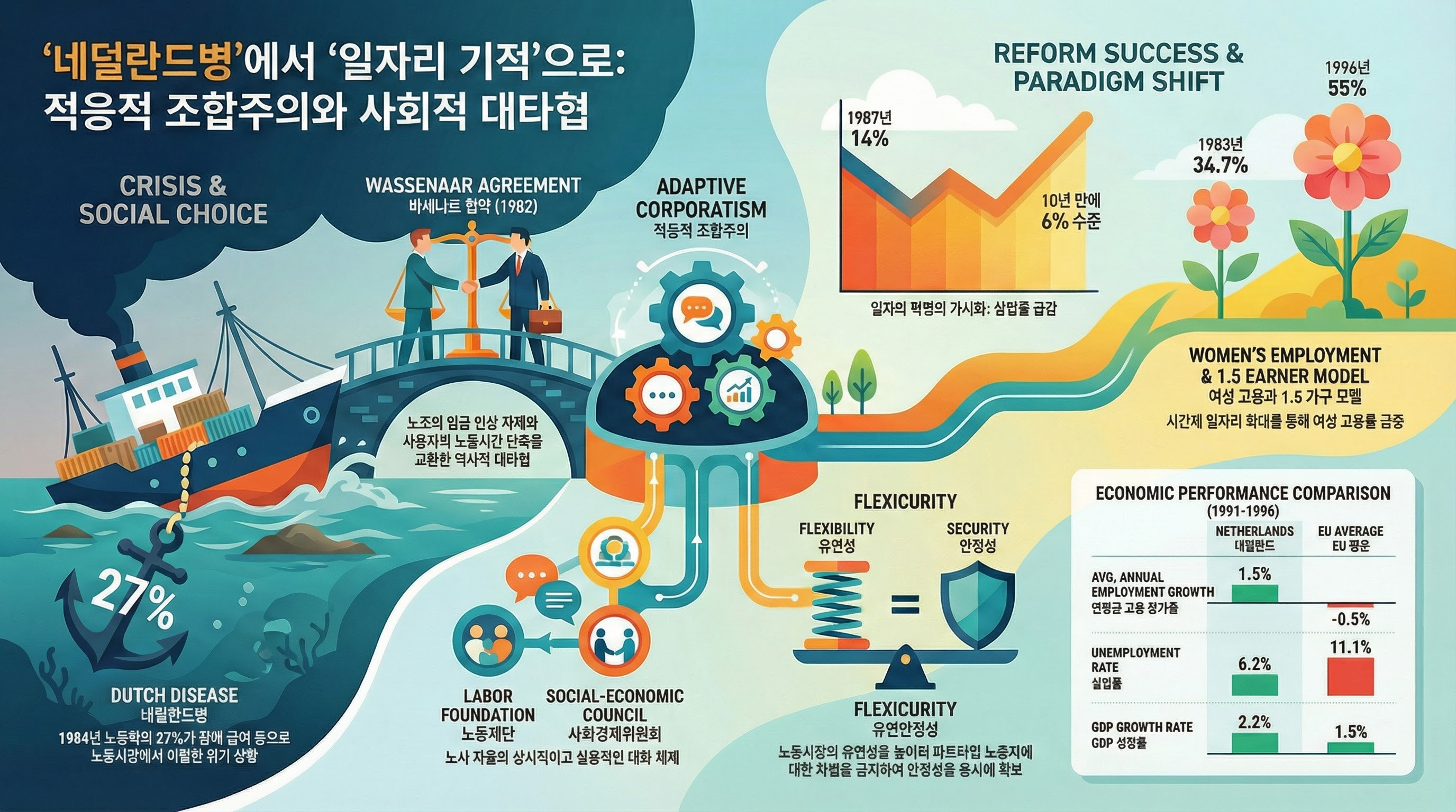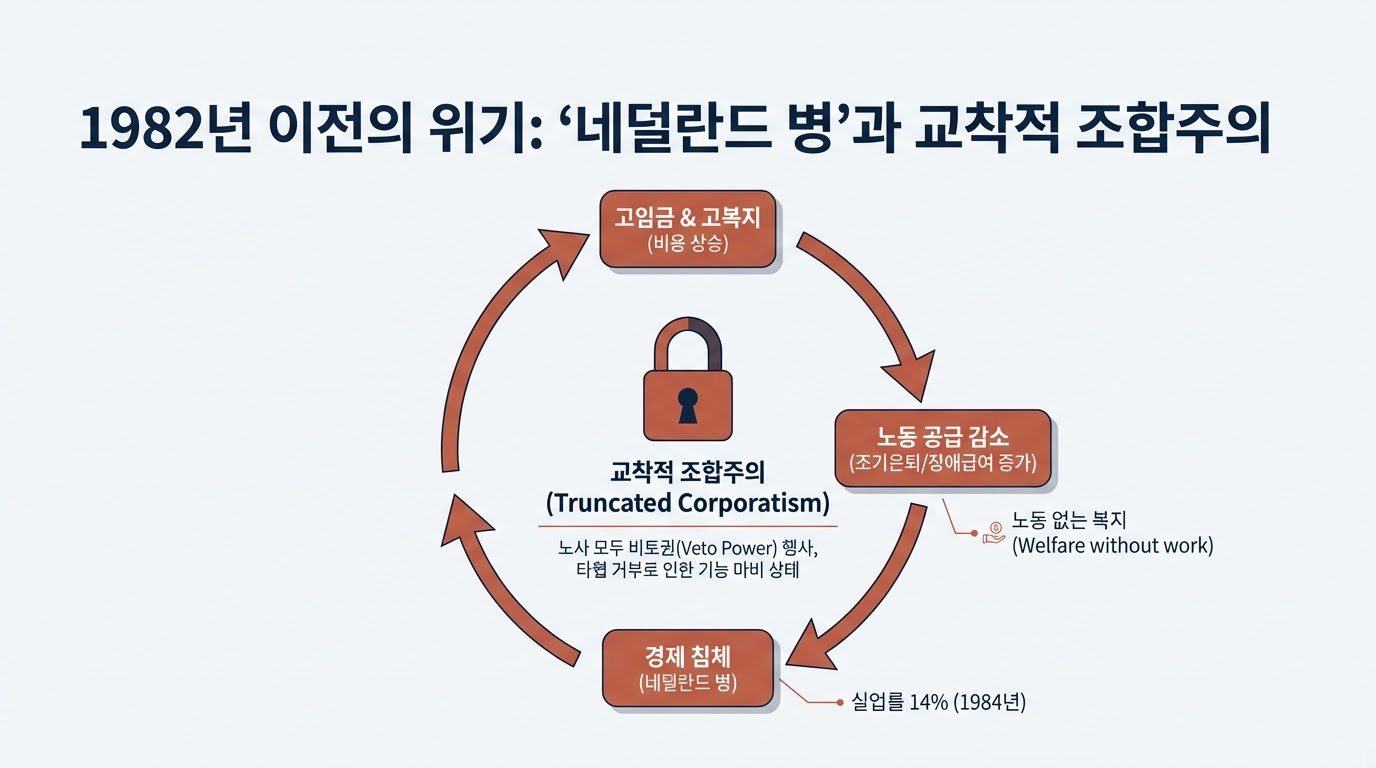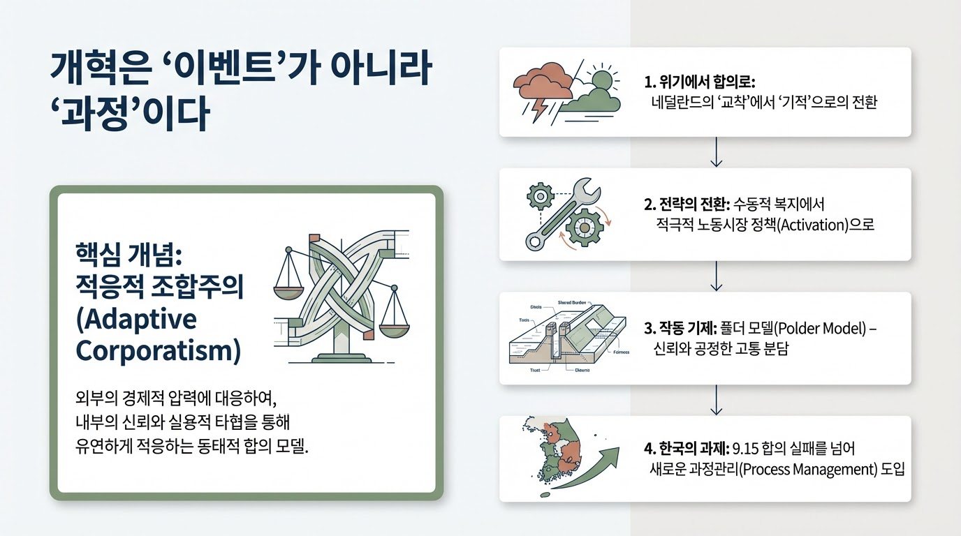네덜란드는 1980년대 초 노동력의 27%가 시장에서 이탈하는 '네덜란드 병'을 앓았습니다. 당시 네덜란드의 개혁은 이웃 유럽 국가들에 비해 상대적으로 **'지체된 대응'**이었으나, 그만큼 더 혁신적인 **'적응적 조합주의'**를 탄생시켰습니다.