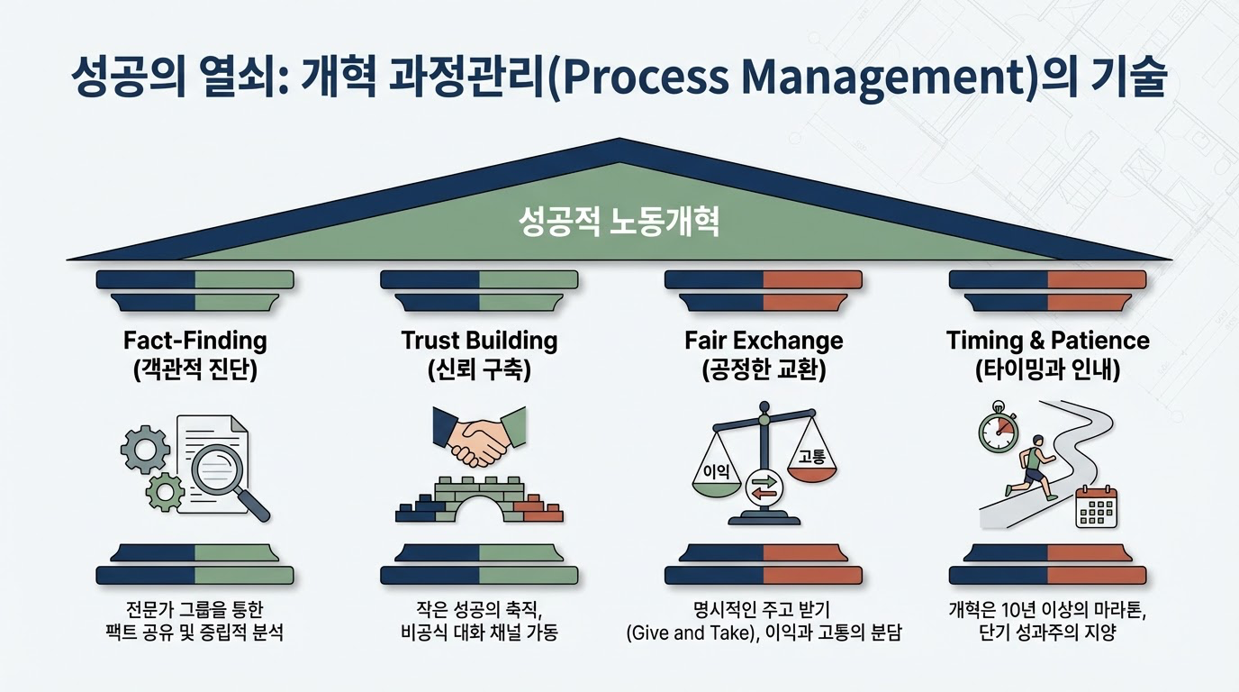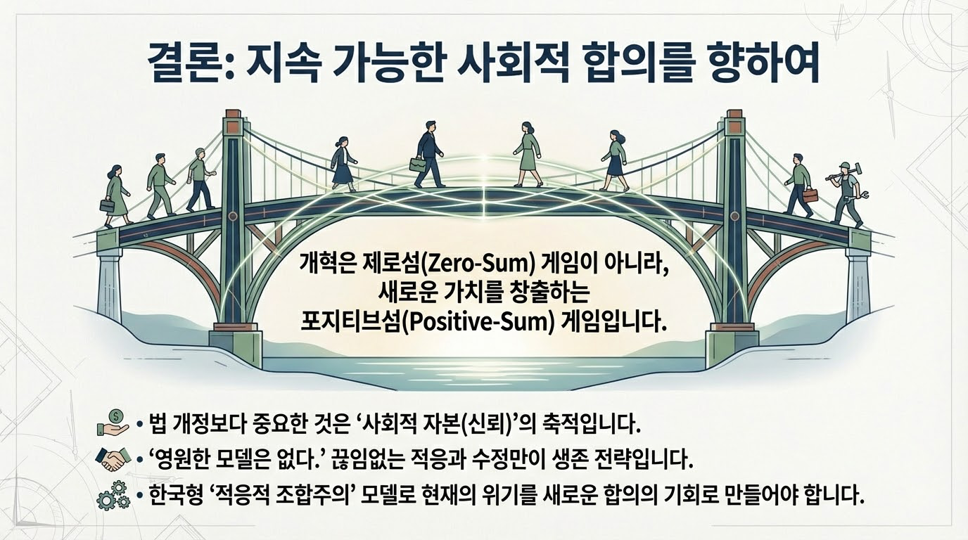한국의 '9.15 사회적 대타협' 사례는 합의 그 자체보다 **'과정 관리'**가 얼마나 중요한지 극명하게 보여줍니다. 어렵게 도출한 합의가 이행 과정에서 갈등을 빚고 파기되는 상황은, 개혁이 단순한 '빅딜'로 완성되는 것이 아님을 시사합니다.
