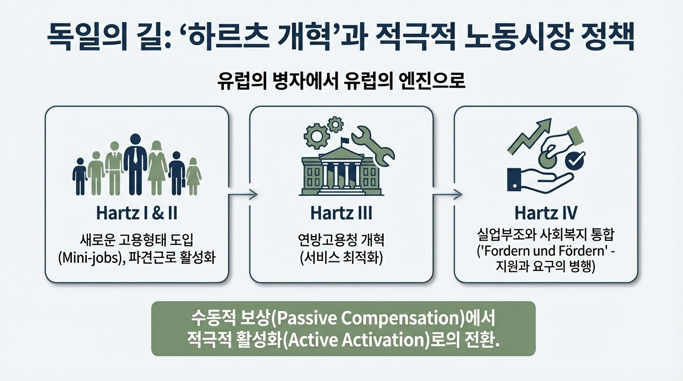 독일은 2000년대 초반 '유럽의 병자'로 전락한 사회국가(Sozialstaat) 모델을 현대화하기 위해 '하르츠 개혁(Hartz Reforms)'이라는 고강도 처방을 단행했다. 이는 노동시장의 재균형화를 목표로 한 체제 수술이었다.