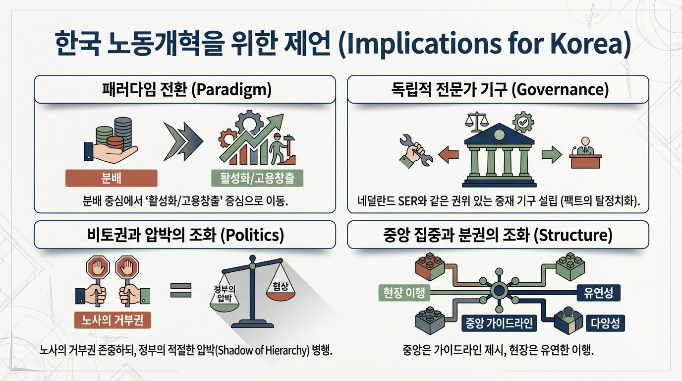 - 전문가 집단의 독립적 권위 확보: 네덜란드 SER의 '왕립위원' 사례처럼, 정치적 외풍으로부터 자유로운 독립적 전문가 집단이 객관적 사실에 기반한 대안을 제시하고 노사정의 신뢰를 중재하는 '지적 인프라'를 구축해야 한다.
