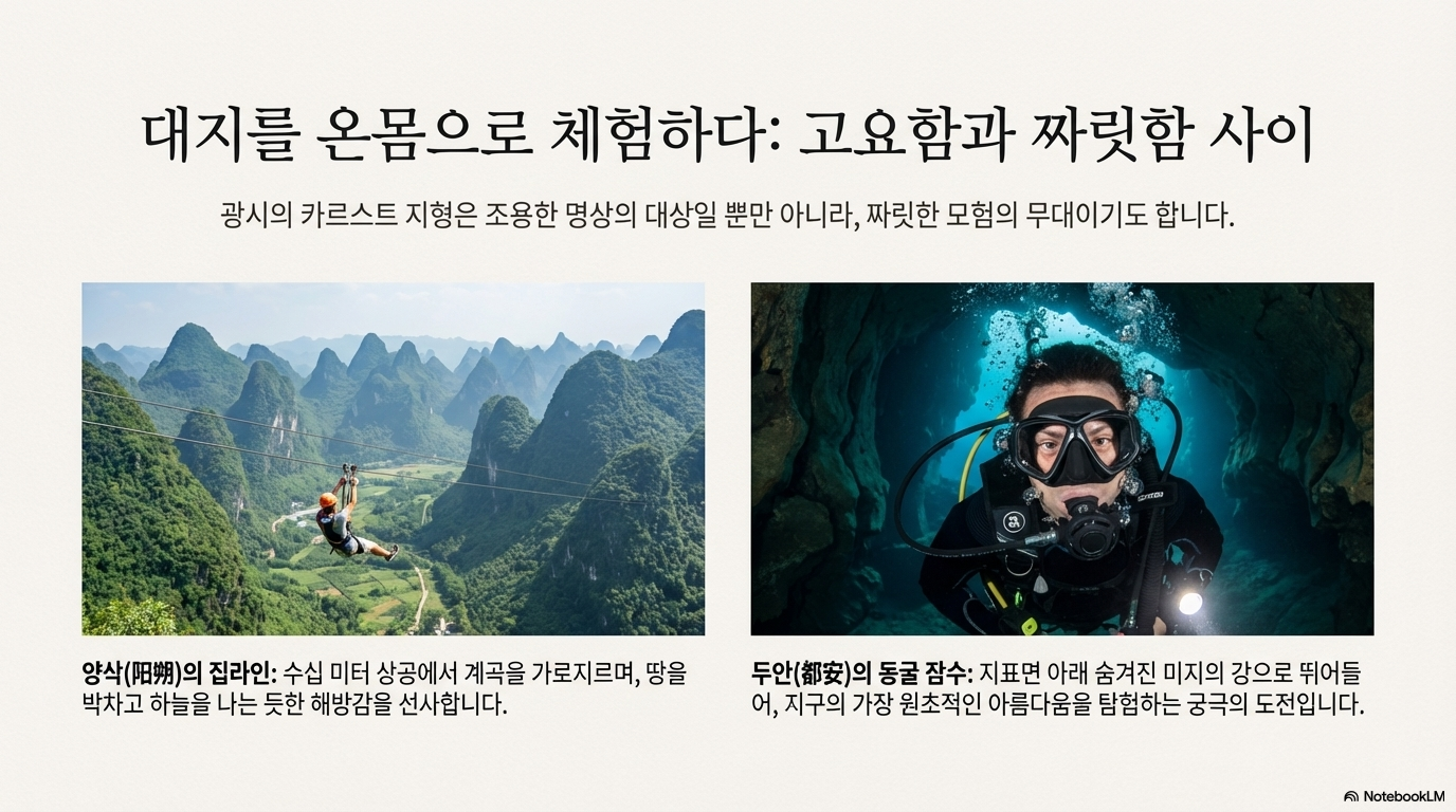 광시성 여행의 첫 번째 핵심 가치는 경이로운 대자연과의 교감입니다. 본 모듈은 단순히 아름다운 풍경을 눈으로 감상하는 것을 넘어, 온몸으로 자연의 신비를 느끼고 탐험하는 역동적인 활동들로 구성되어 있으며, 이는 최근 급증하는 어드벤처 및 생태 관광 수요에 완벽하게 부응하는 핵심 요소입니다. 여행객은 잊지 못할 성취감과 감동을 얻으며 여행의 서막을 열게 될 것입니다.