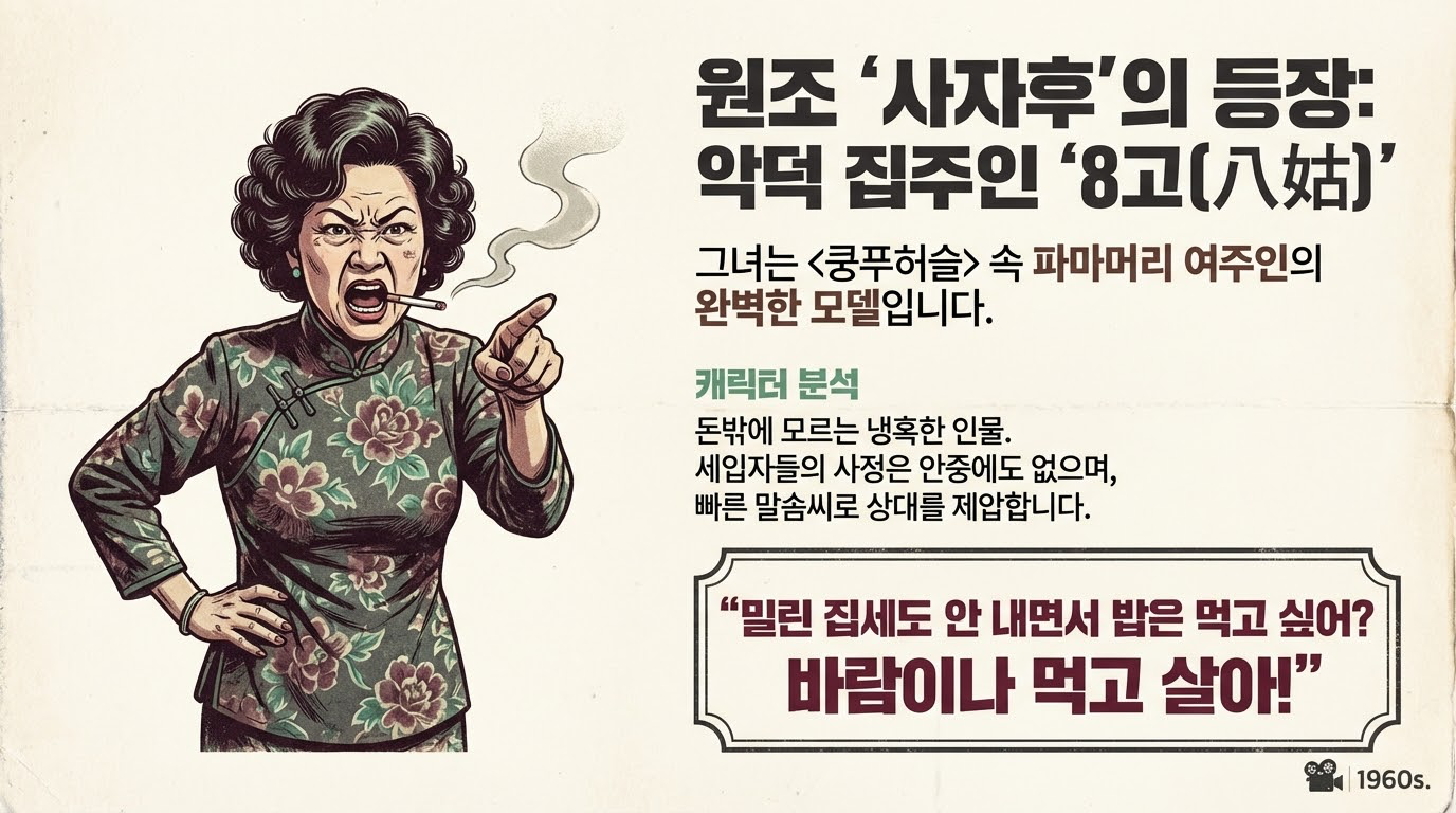 <쿵푸>의 소조바 캐릭터는 1963년작의 여주인 **'백로판'**에게서 그 유전자를 그대로 이어받았습니다. 그녀는 72가구의 세입자가 밀집해 사는 낡은 건물의 실질적인 지배자이자, 당시 홍콩의 열악한 주거 환경에서 군림하던 기득권층을 투영한 인물입니다.