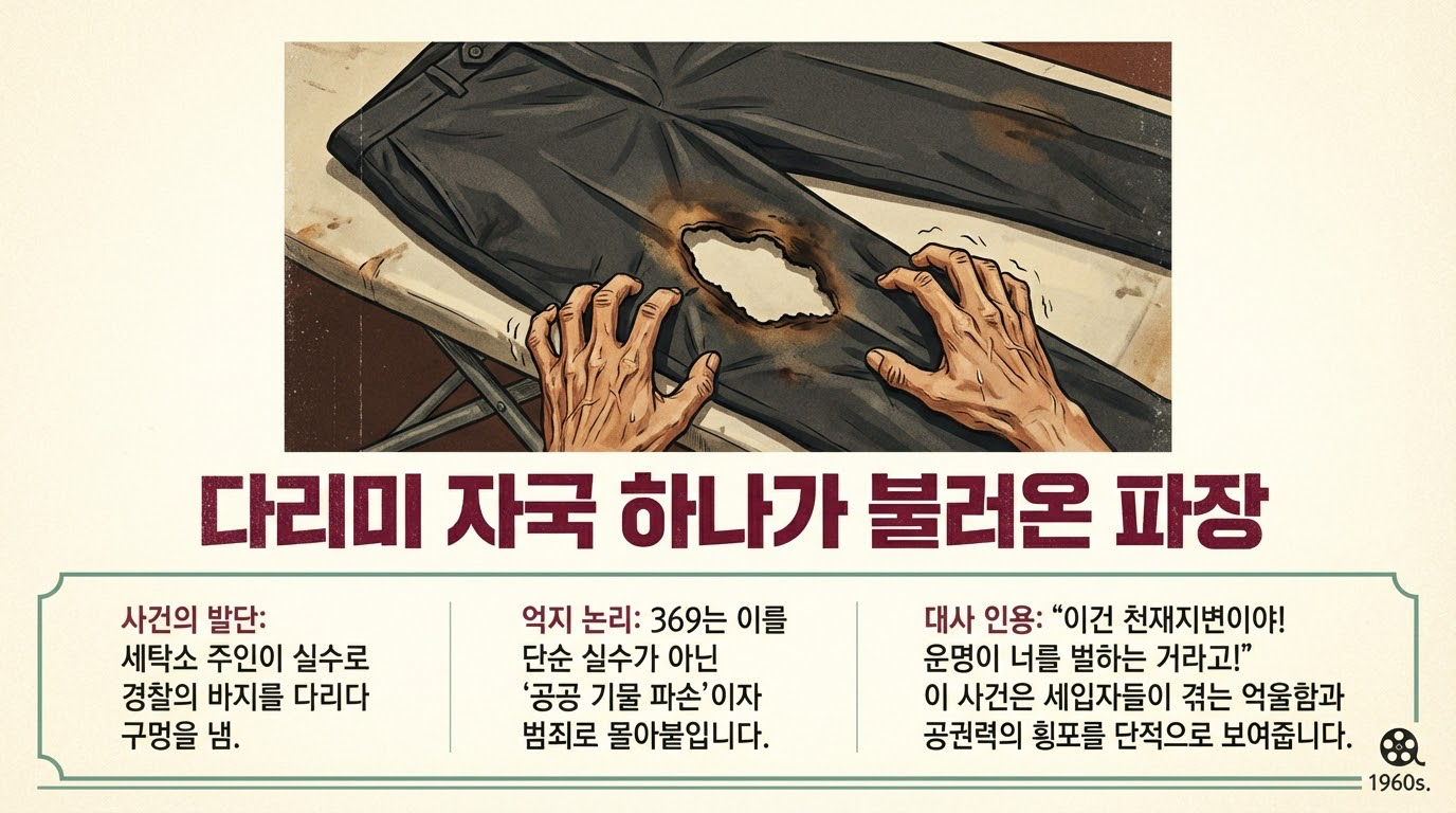 - 수사적 폭력에 대한 노출: 집주인과 369가 타버린 바지를 보며 "이것은 천재지변이자 각자의 운명(天災人禍/各安天命)"이라며 비웃는 장면은, 가해자가 피해자의 고통을 운명론으로 치부하여 책임을 회피하는 **'수사학적 폭력'**의 극치를 보여줍니다.