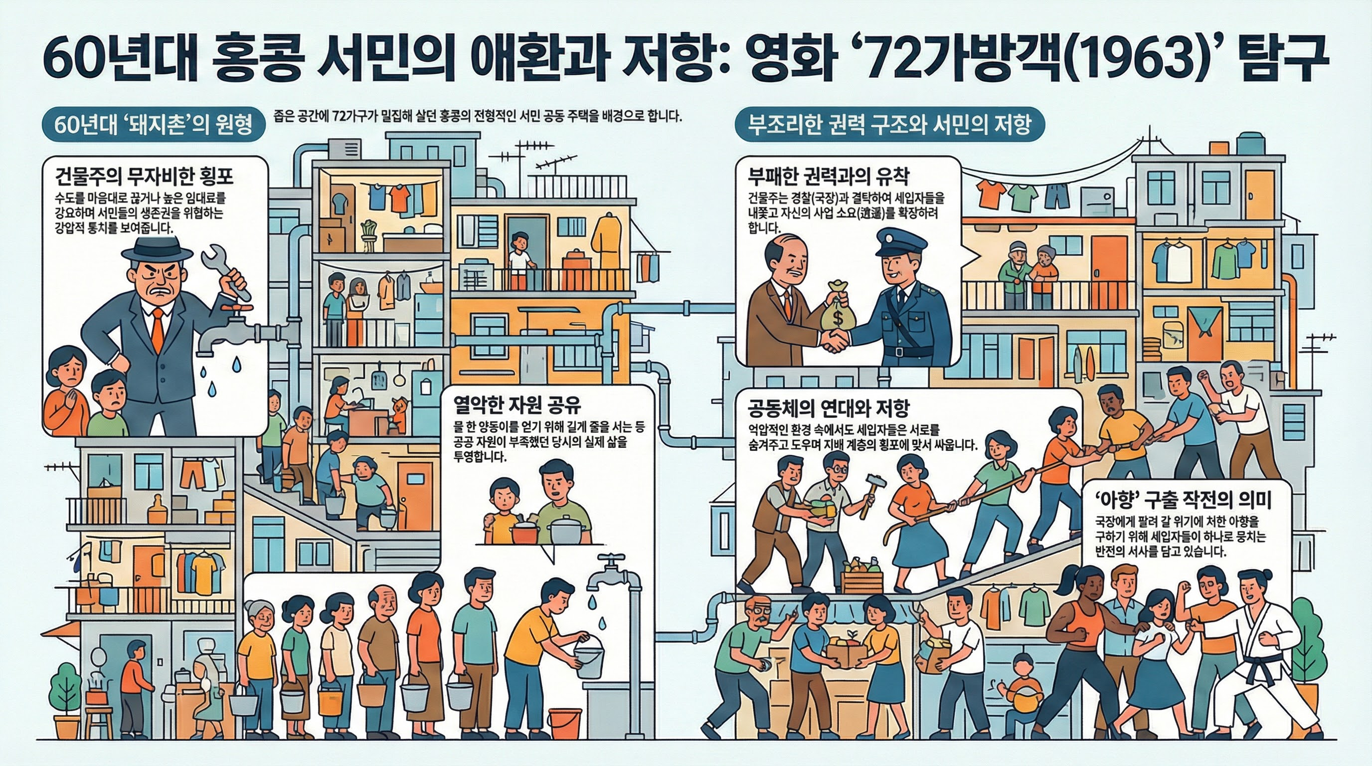 이 문서는 1963년 제작된 영화 '칠십이가방객(72家房客)'의 대사 발췌본을 바탕으로 한 학습 가이드입니다. 이 작품은 1960년대 홍콩 혹은 광둥 지역의 서민적 삶과 사회적 갈등을 생생하게 담고 있으며, 후대 홍콩 영화(주성치의 '쿵푸' 등)에 큰 영감을 준 것으로 알려져 있습니다. 본 가이드는 텍스트의 핵심 사건, 인물 간의 역학 관계, 그리고 당시 사회상을 분석하는 데 중점을 둡니다.