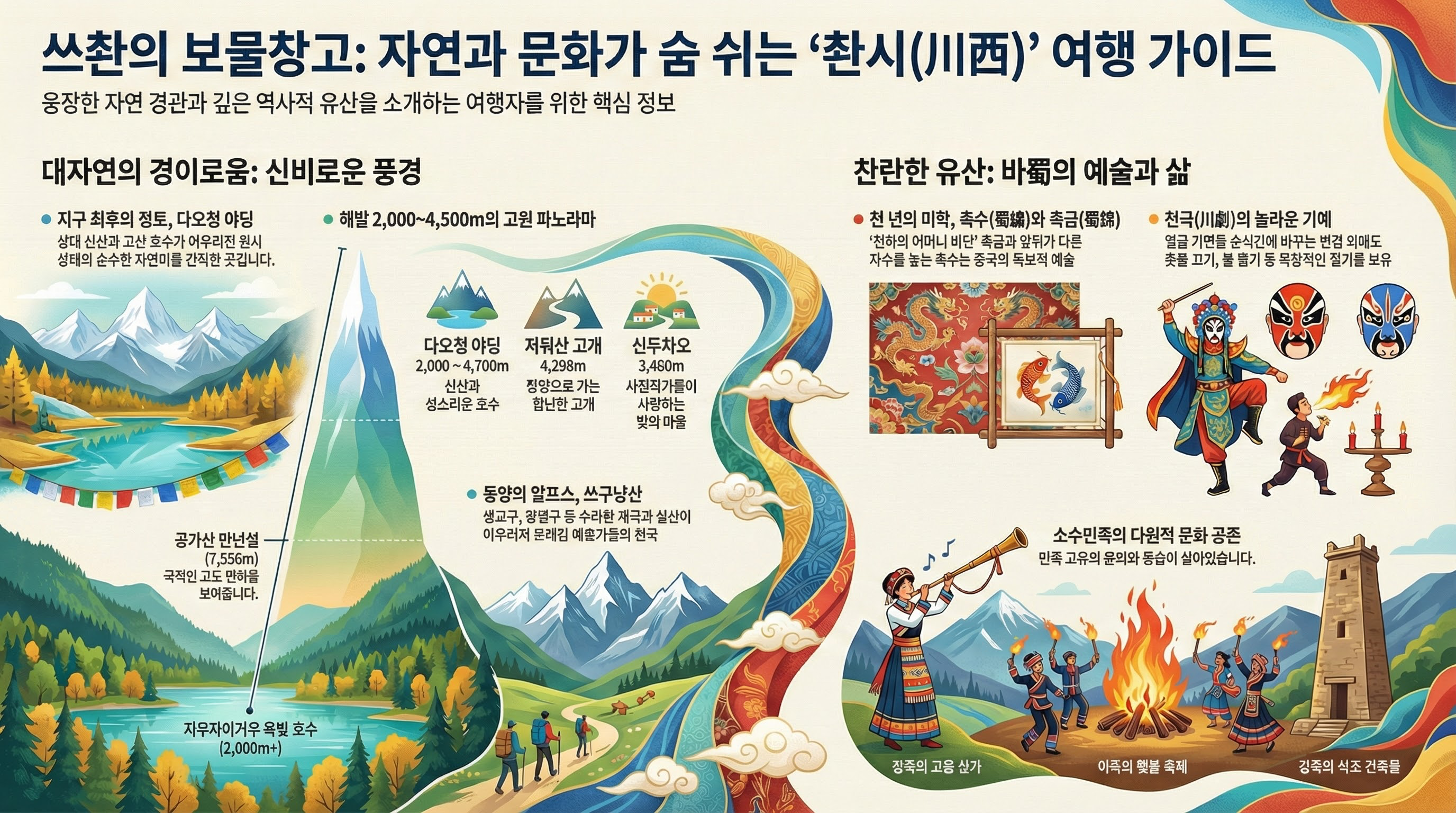 [진행자]: 那我們就正式進入那個旅行者心中的川西吧。資料里全是“東方阿爾卑斯”、“攝影家天堂”這種詞兒,聽著就讓人心跳加速。咱們先從山說起吧。 (Nà wǒmen jiù zhèngshì jìnrù nàge lvǚxíngzhě xīnzhōng de Chuānxī ba. Zīliào lǐ quánshì “Dōngfāng ā'ěrbēisī”, “shèyǐngjiā tiāntáng” zhèzhǒng cír, tīngzhe jiù ràng rén xīntiào-jiāsù. Zánmen xiān cóng shān shuōqǐ ba.) 그럼 본격적으로 여행자들의 로망인 촨시로 들어가 봅시다. 자료에는 '동양의 알프스', '사진작가의 천국' 같은 단어들로 가득해서 듣기만 해도 설레네요. 우선 산 이야기부터 해볼까요.