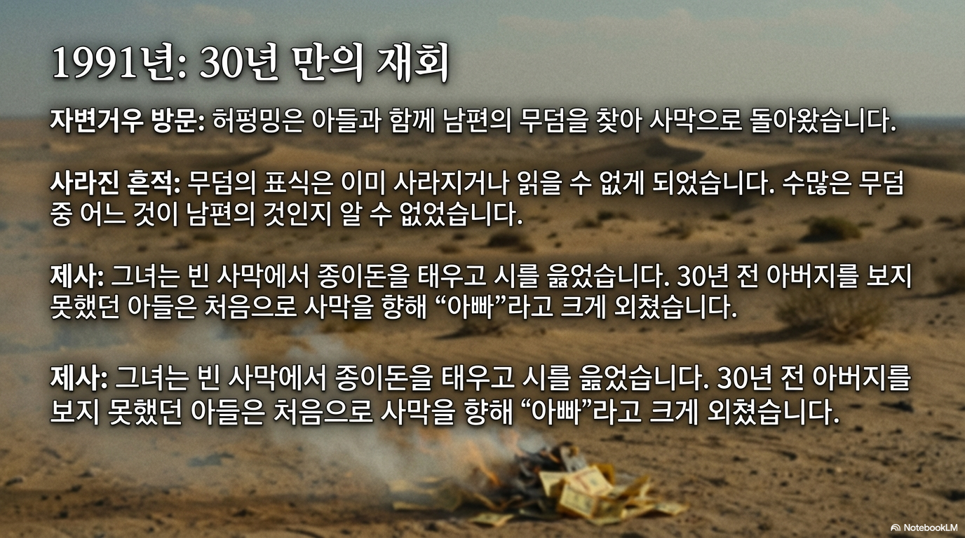 허펑밍의 노모 역시 딸이 겪는 끊임없는 정치적 박해와 재하방(再下放) 과정을 지켜보며 절망 속에 생을 마감했습니다. 이는 권력이 한 개인을 낙인찍음으로써 그와 연결된 가족 공동체 전체를 서서히 죽음으로 몰아넣는 '연쇄적 살인'의 과정이었습니다. 30년 후 허펑밍이 왕징차오의 시신조차 찾지 못한 채 텅 빈 사막에서 통곡해야 했던 사실은, 정치적 폭력이 남긴 지울 수 없는 역사의 흉터입니다.