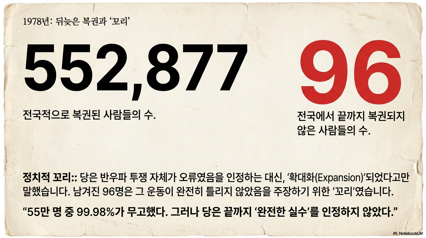 1978년 이후 단행된 복권 조치에서 우파 지식인의 **99.98%**가 '착오에 의한 것'으로 판명되어 명예를 회복했습니다. 그러나 이 경이적인 통계 수치는 역설적으로 반우파 투쟁이 얼마나 실체 없는 '정치적 연극'이었는지를 증명합니다.