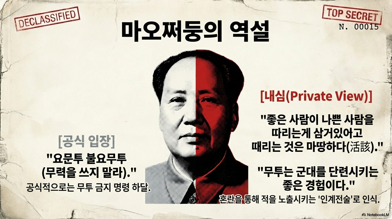 - 공식 입장과 실제적 방임: 16조 문건에서는 "문투를 하고 무투를 하지 말라"고 명시했으나, 사석에서는 **"좋은 사람이 나쁜 사람을 때리는 것은 활개 치는 일(活該)"**이라며 폭력을 정당화했습니다.