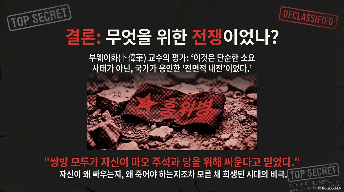 최종 메시지: 무투 현장의 사람들은 자신이 ‘진정한 혁명’과 ‘마오 주석’을 위해 싸우고 있다고 확신했습니다. 그러나 그 확신은 수백만 명의 죽음과 국가적 마비를 불러왔습니다. 역사는 우리에게 법치주의와 갈등 관리 시스템이 붕괴된 사회에서 '정의'라는 이름의 폭력이 얼마나 맹목적이고 잔인해질 수 있는지를 통렬하게 가르쳐주고 있습니다.