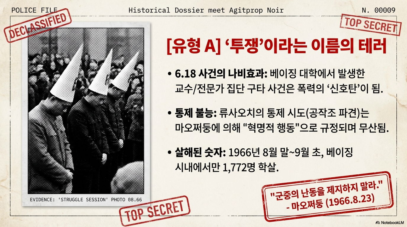 - 2단계: 신체적 접촉과 난투극: 1966년 북경대 **'618 사건'**이 대표적입니다. 무조직적인 구타와 모욕이 자행되었으나, 마오쩌둥은 이를 "혁명적 행동"이라 치켜세우며 폭력의 '댐 문(閘門)을 열어버리는' 결정적 계기를 제공했습니다.