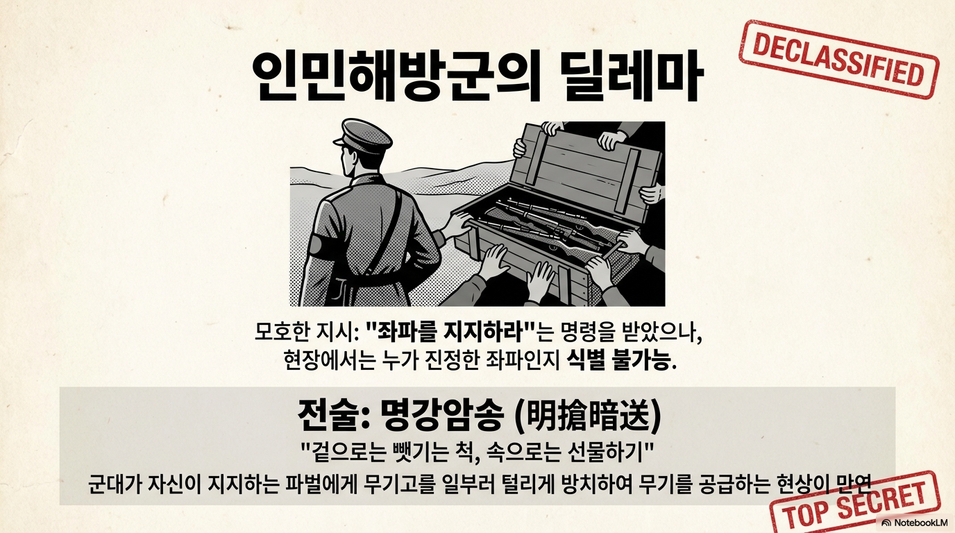 특히 지방 군부(성군구)는 '좌파 무장' 지침을 이행함에 있어 기준의 모호함에 직면했다. 이들은 과거의 기준(당원 여부, 성분 등)으로 파벌을 판단하다가 중앙의 의도와 충돌하자, 책임을 피하기 위해 '명강암송(明搶暗送, 겉으로는 뺏기는 척하며 속으로는 무기를 넘겨줌)'이라는 기만적 행태를 보였다.