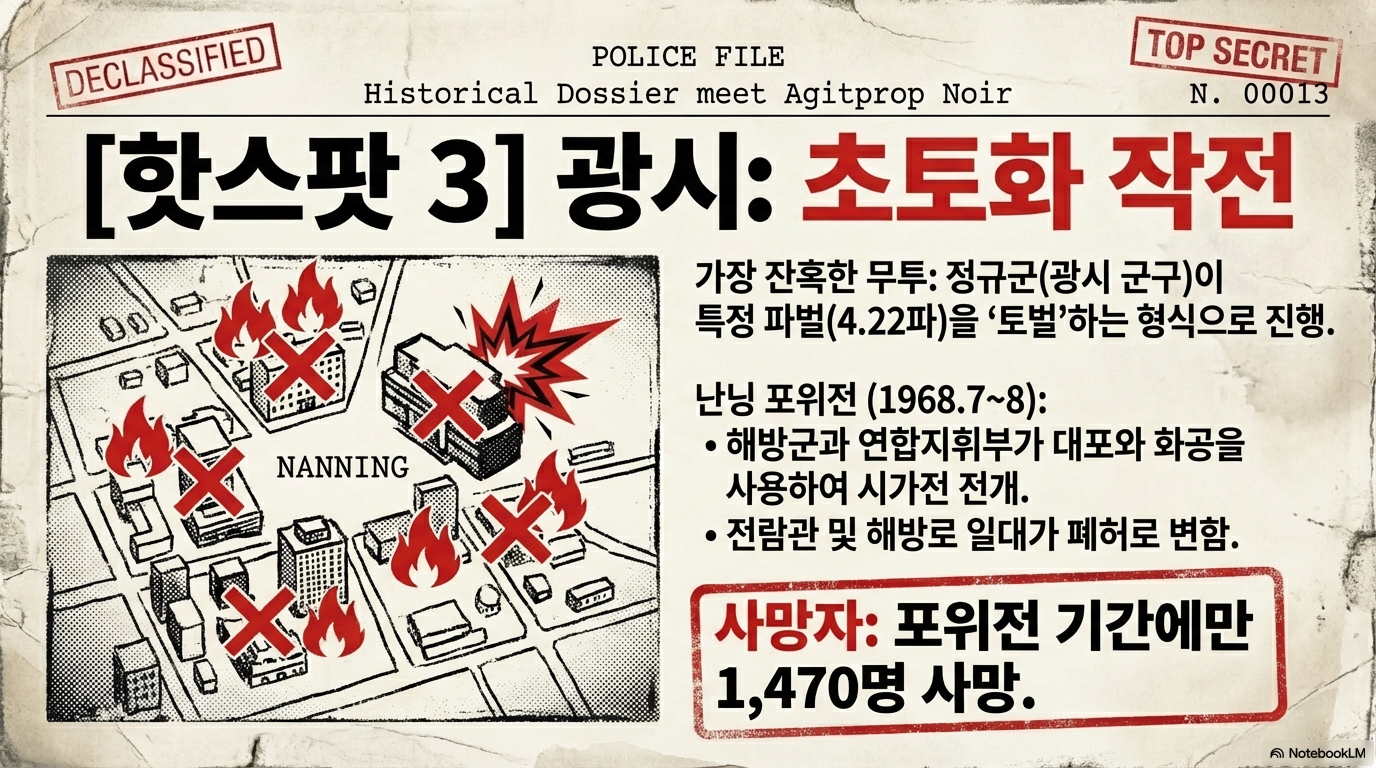 📍 광시(廣西): 국가 권력에 의한 조직적 학살 군부와 보수파 연합군이 조반파인 '422' 진영을 진압하며 1,000명 이상을 사살했습니다. 특히 비극적인 사실은 포로로 잡힌 7,012명 중 2,324명이 각 현으로 송환된 후 잔혹하게 살해되었다는 점입니다. 이는 혁명의 이름으로 자행된 인간 소외의 극치였습니다.
