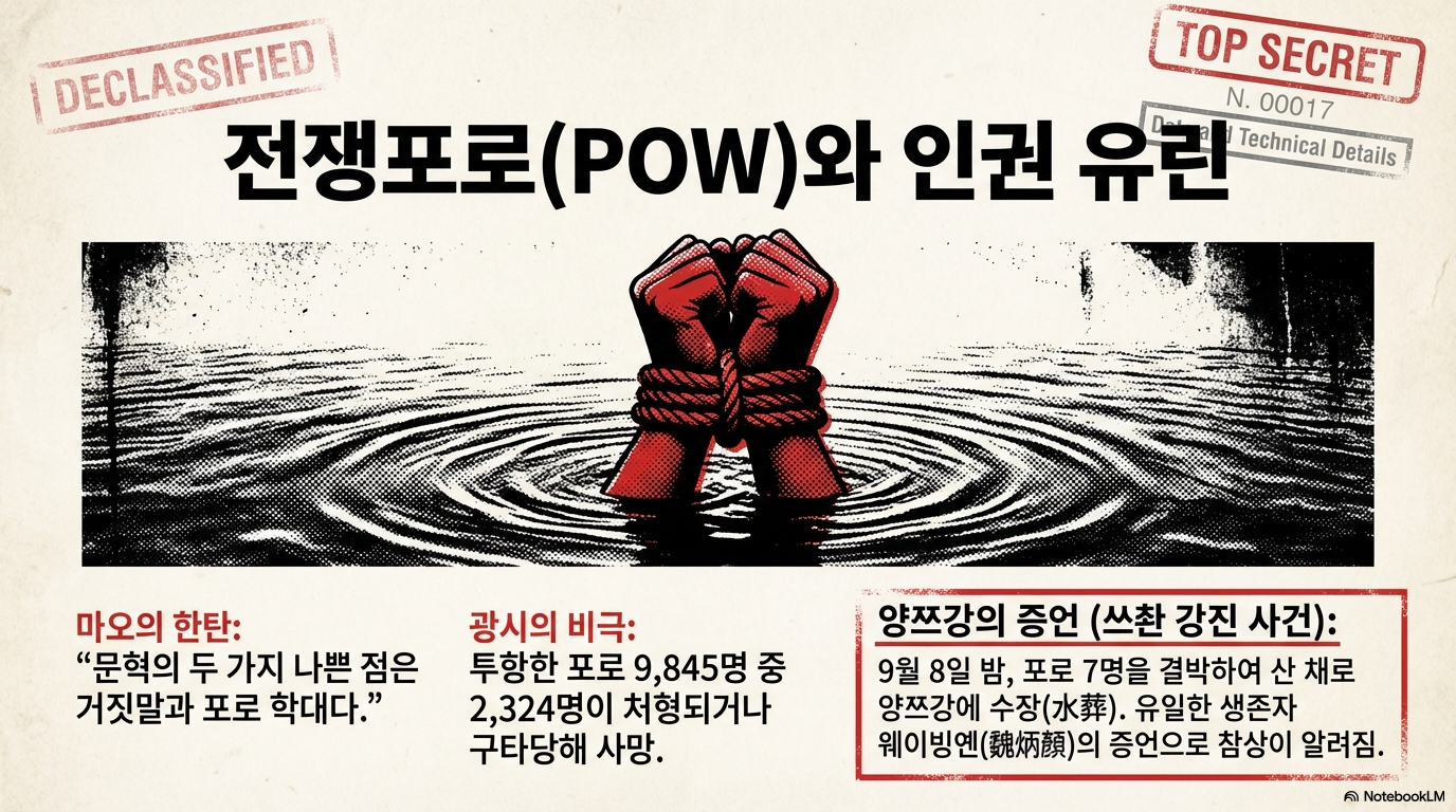 무투 과정에서의 포로 학대는 형용할 수 없을 만큼 참혹했습니다. 1967년 9월 쓰촨 장진(현재의 충칭)에서는 '97파'가 포로 15명을 집단 린치하고, 그중 7명을 결박한 채 양쯔강 한복판에서 총살하여 유기했습니다. 이 참극에서 기적적으로 생존하여 사건을 세상에 알린 이는 당시 중학생이었던 **웨이빙얀(魏炳颜)**이었습니다.