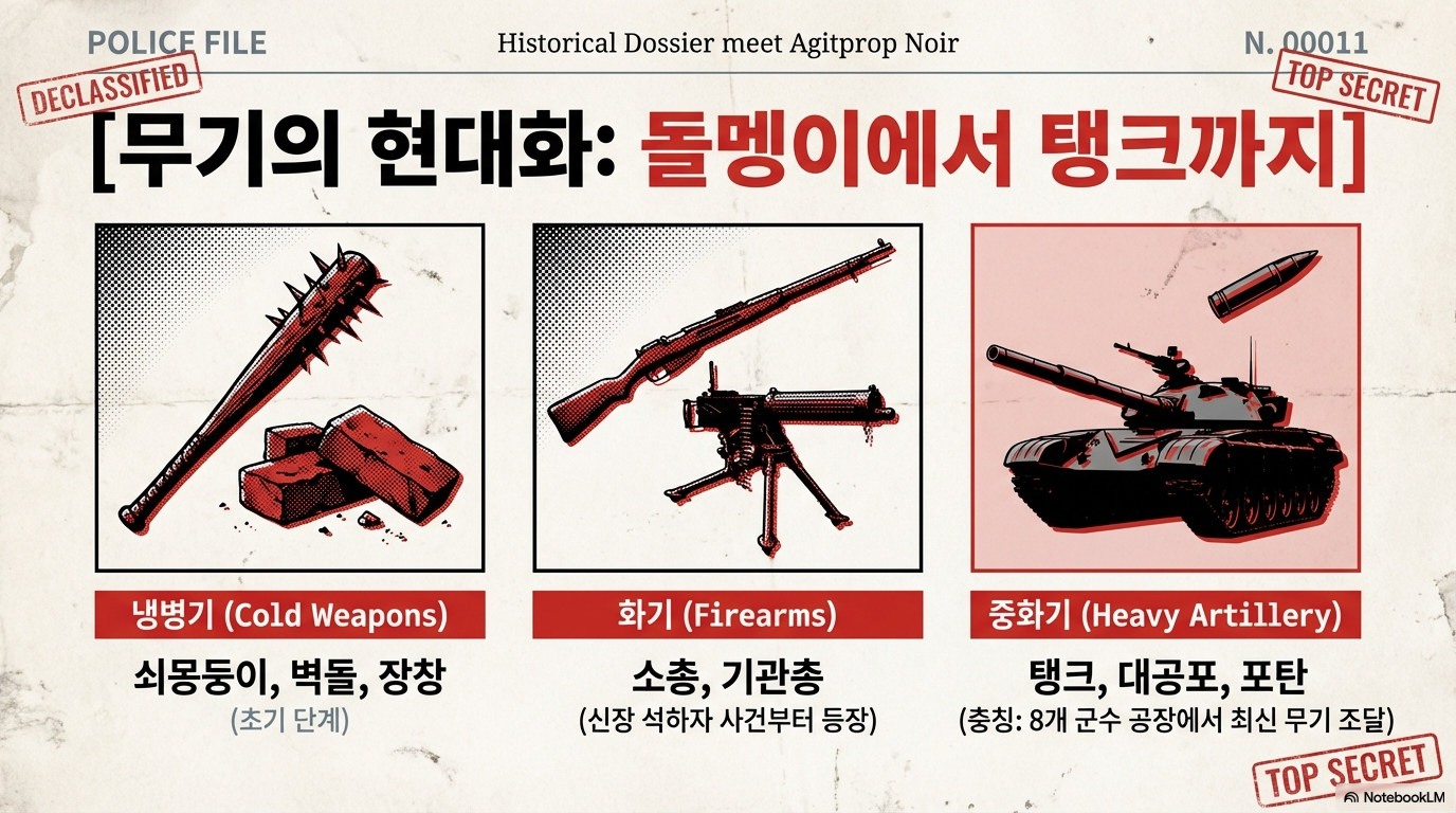 - 4단계: 현대식 화력전(무투): 1967년 여름 이후, 군수 창고를 탈취하면서 총기, 대포, 탱크가 동원됨. 국가가 세운 군수공장에서 생산된 무기가 국민을 살상하는 도구로 전락했습니다.