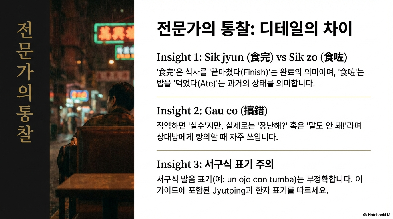 **"搞錯 (Gau2 co3)"**는 단순히 실수했다는 뜻을 넘어 "장난해?", "말도 안 돼"와 같은 강력한 항의의 의미를 내포합니다. 격식 있는 현장에서는 감정적 마찰을 일으킬 수 있으므로 사용에 각별히 유의해야 합니다.