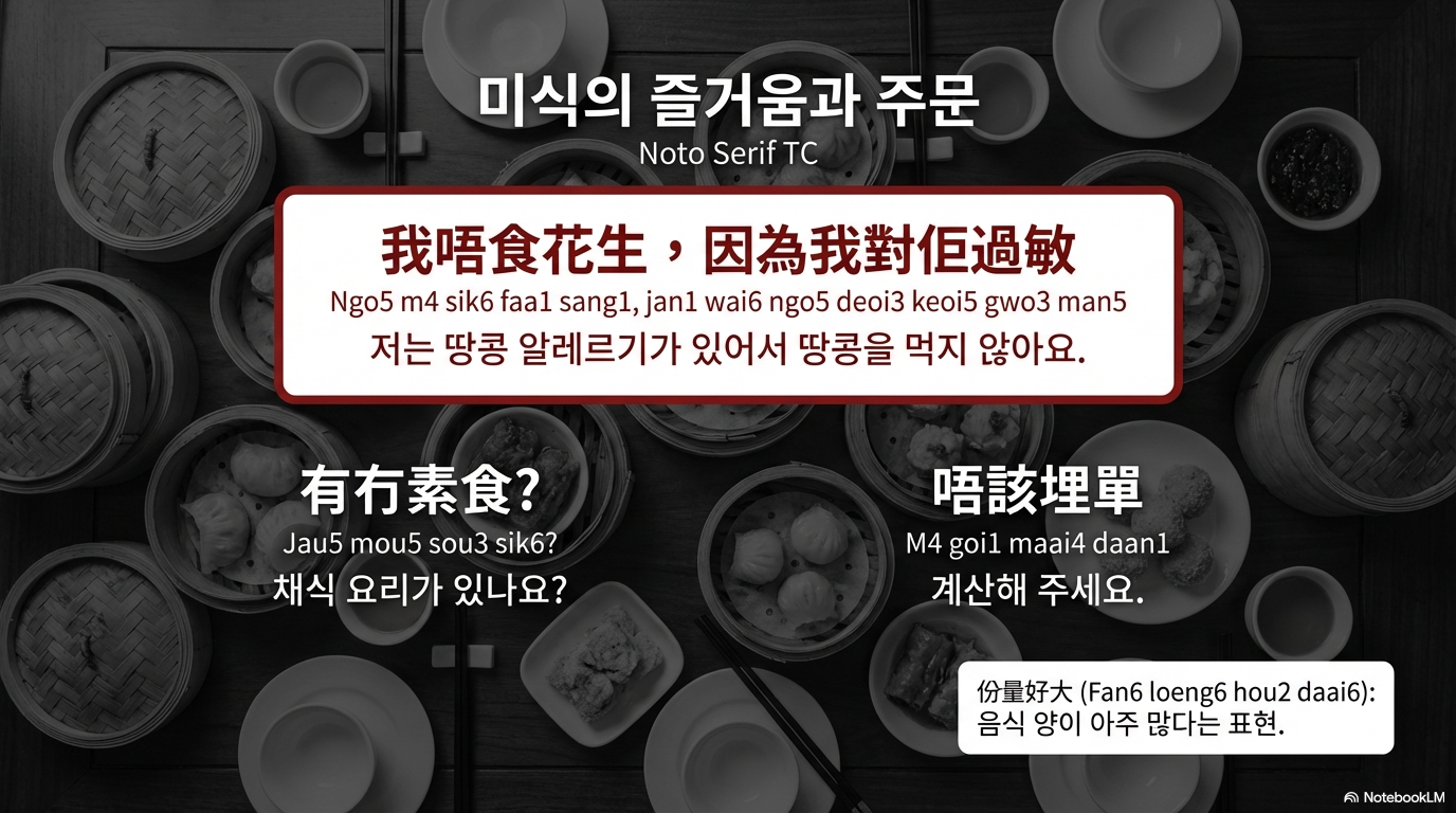 - 알레르기 고지: "저는 땅콩 알레르기가 있어요." (我有花生過敏 - Ngo5 jau5 faa1 sang1 gwo3 man5)