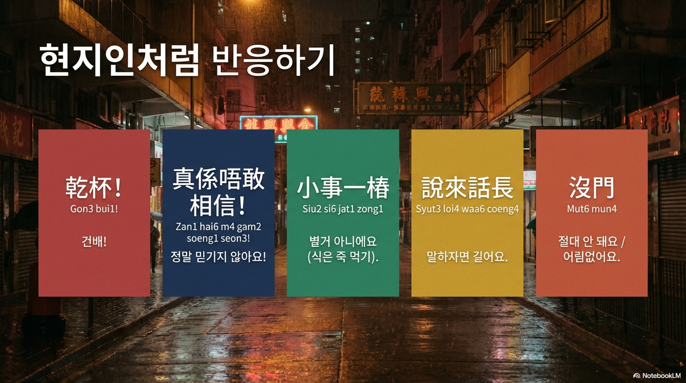 - 상황별 요청: 지도 요청(攞份地圖), 사진 촬영 부탁(幫我影張相), 와이파이 무료 확인(Wi-Fi 係咪免費嘅?) 등.
