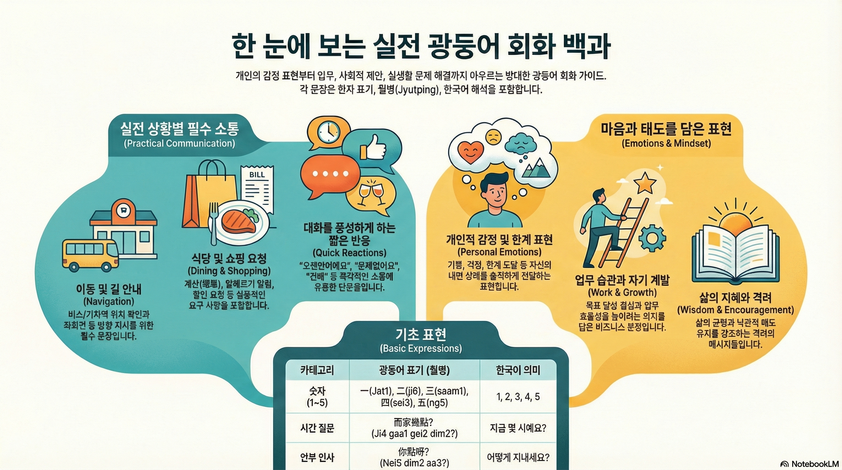 이 학습 가이드는 제공된 광둥어 회화 메모 소스를 바탕으로, 학습자가 실생활과 업무 환경에서 쓰이는 핵심 표현을 체계적으로 복습하고 심화 학습할 수 있도록 설계되었습니다. 이 자료는 감정 표현, 업무 에티켓, 이동 및 교통, 식사, 그리고 인생의 지혜를 담은 격언들을 포괄합니다.