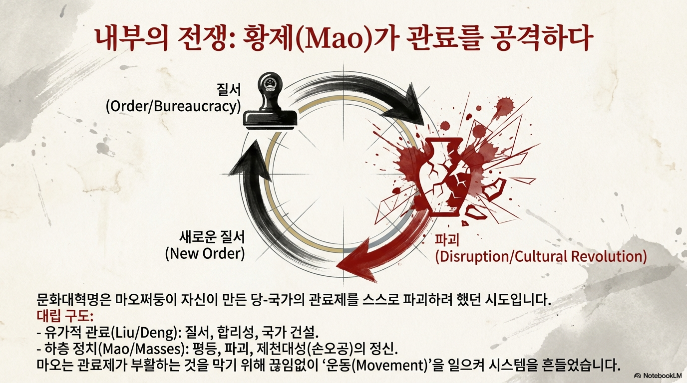 건국 이후 모택동은 소련식 관료 체제를 이식했지만, 곧 그것을 불신하기 시작했습니다. 관료주의가 혁명의 열기를 식힌다고 판단한 그는 스스로를 '법도 하늘도 없는(無法無天)' 존재로 규정하며 관료 체제를 파괴하고 정화하는 **‘운동형 통치’**에 매진했습니다.