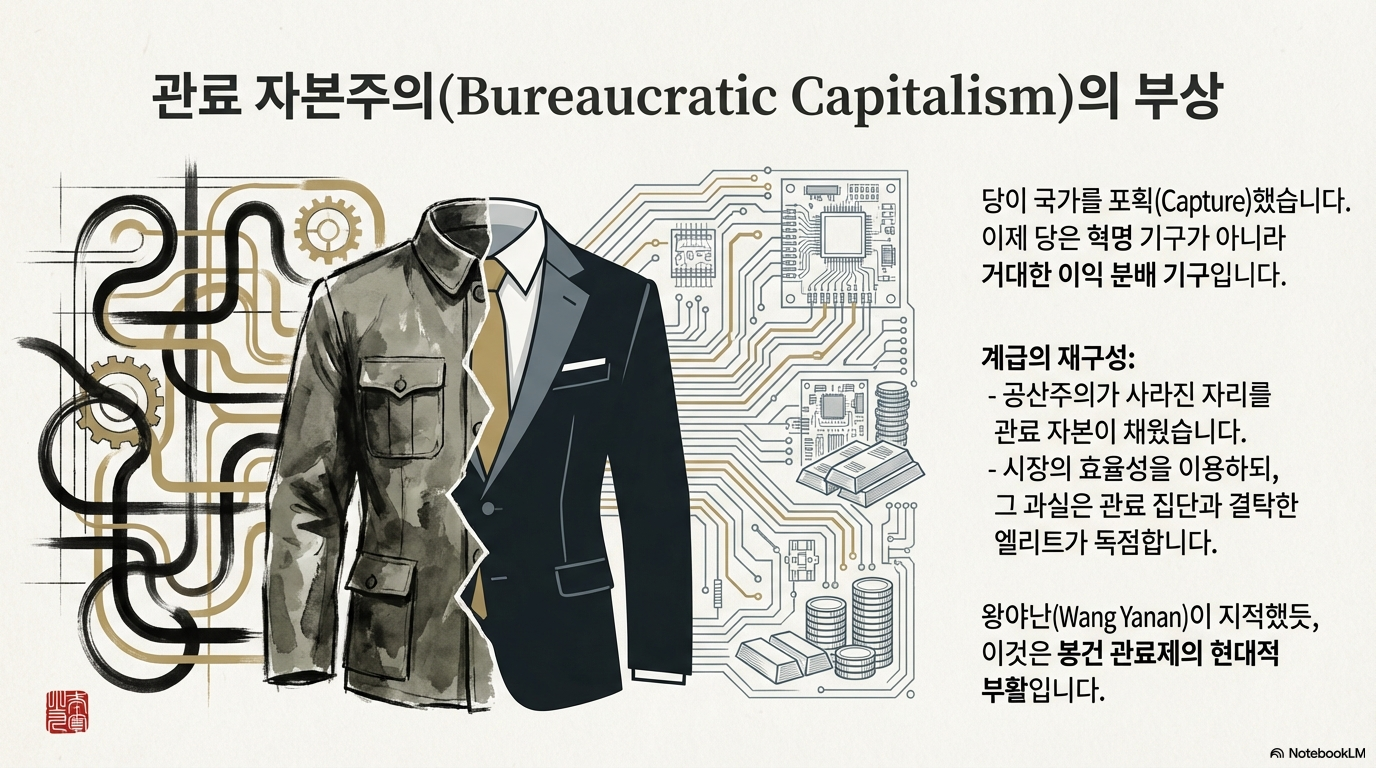 1989년 천안문 사건 이후, 중국은 '후기 위권주의(Late Authoritarianism)' 단계로 진입합니다. 시장 경제를 도입해 부를 창출하되, 그 결실은 당이 통제하는 **'관료 자본'**이 독점하는 기형적 구조가 안착된 것입니다.