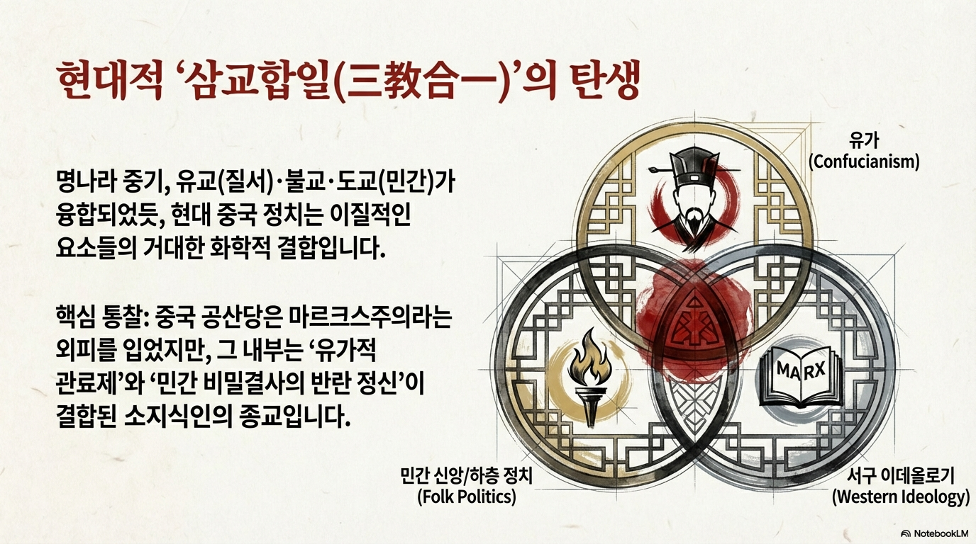 중국 현대 정치의 심장부에는 명나라 중기부터 형성된 '삼합일' 논리가 흐르고 있다. 이는 외래 이론을 수용하되 이를 본토의 신앙과 의식형태로 철저히 개조하여 내면화하는 중국 특유의 정치적 기제다.