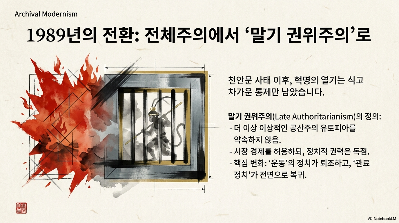 1989년 천안문 사태 이후 중국은 '후기 위권주의' 단계로 진입했다. 이는 극권적 통치 기능을 포기하지 않으면서도 시장 경제를 하이브리드화하여 체제를 유지하는 기묘한 단계다.