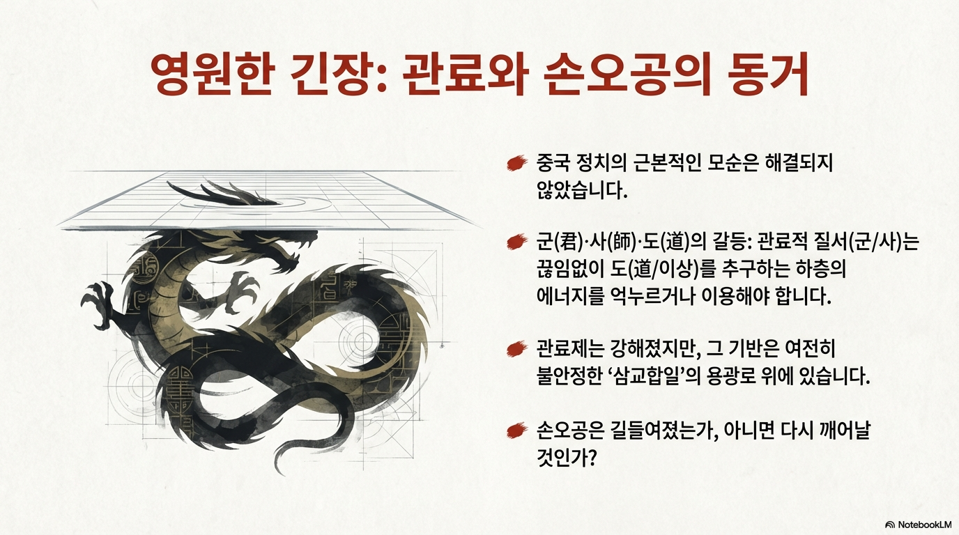 중국 현대 정치의 심장부에는 '제천대성 손오공', 그중에서도 끊임없이 싸워 이기는 '전승투불'의 논리가 흐르고 있습니다. 이는 제도나 법치보다는 투쟁과 동원을 통해 관료주의를 타쇄하려는 속성입니다.