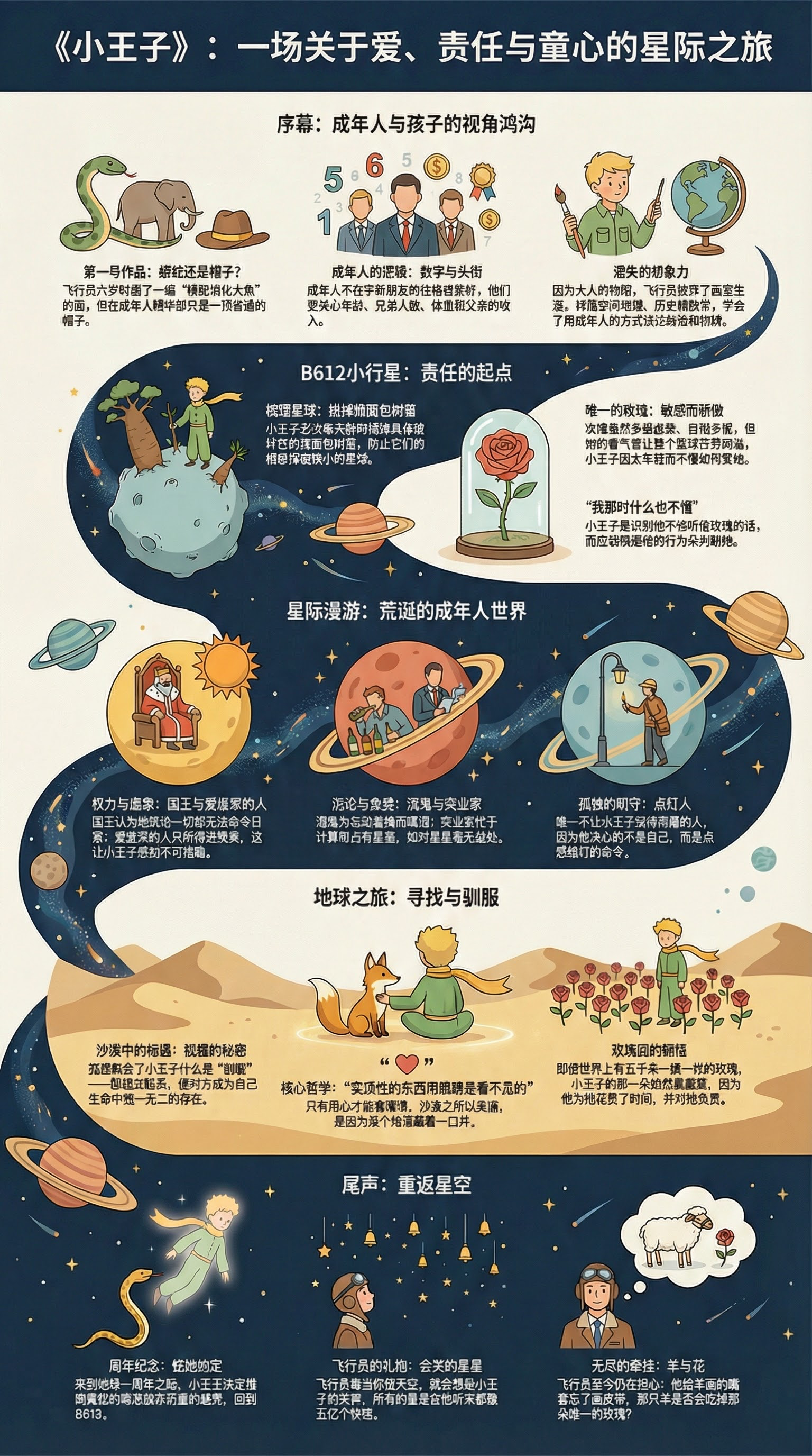 故事也藉由小王子的旅程,引導讀者思考人生的真諦,例如愛、友誼和責任。