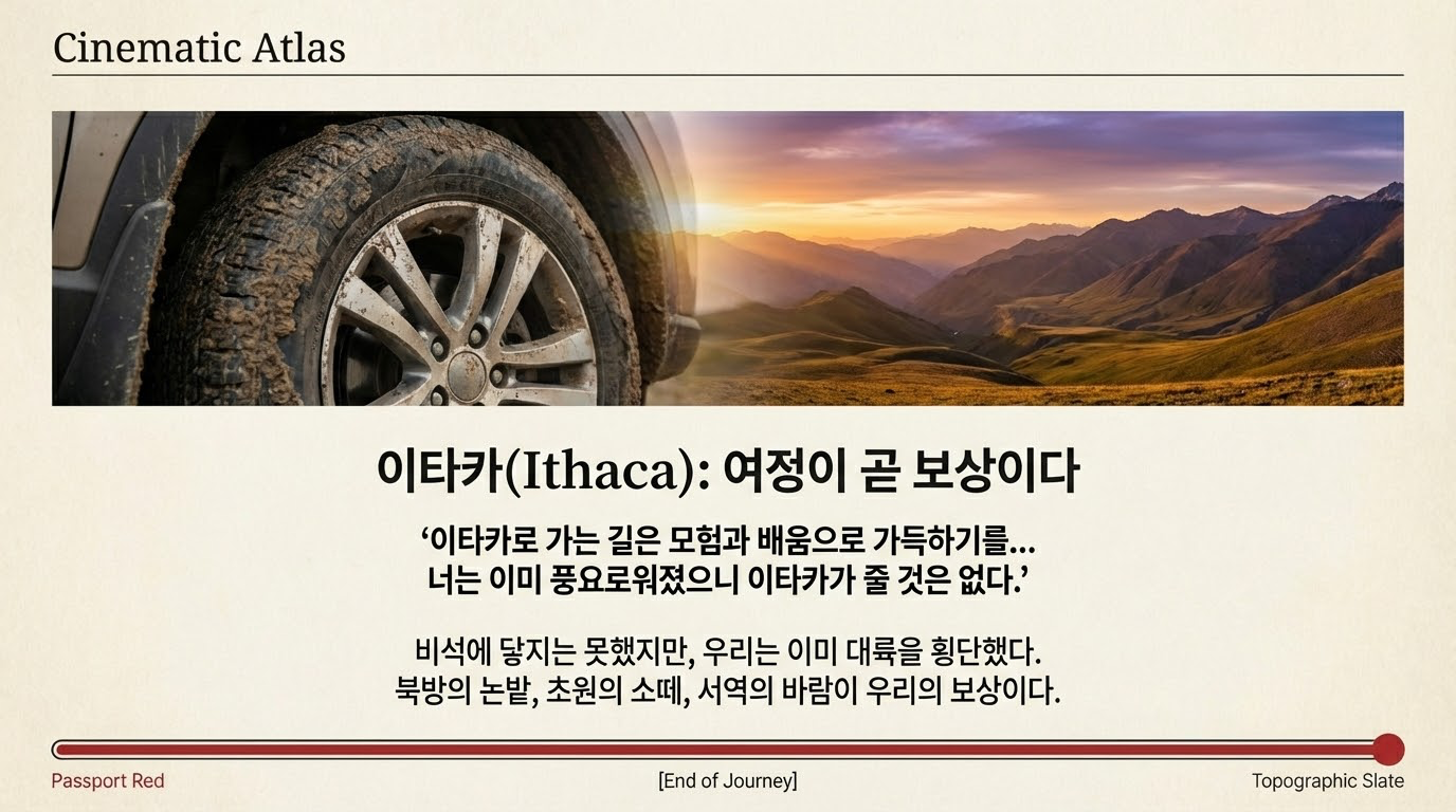 7,655km의 끝에서 우리는 깨닫게 됩니다. 예상치 못한 타이어 펑크로 서부 극점의 기념비에 오르지 못하거나, 계획했던 풍경을 놓칠 수도 있습니다. 하지만 콘스탄티노스 카바피의 시 **<이타카(Ithaca)>**가 말하듯, 우리를 풍요롭게 만드는 것은 목적지에 도착하는 순간이 아니라 그곳으로 향하는 길 위에서 얻은 모험과 발견입니다.