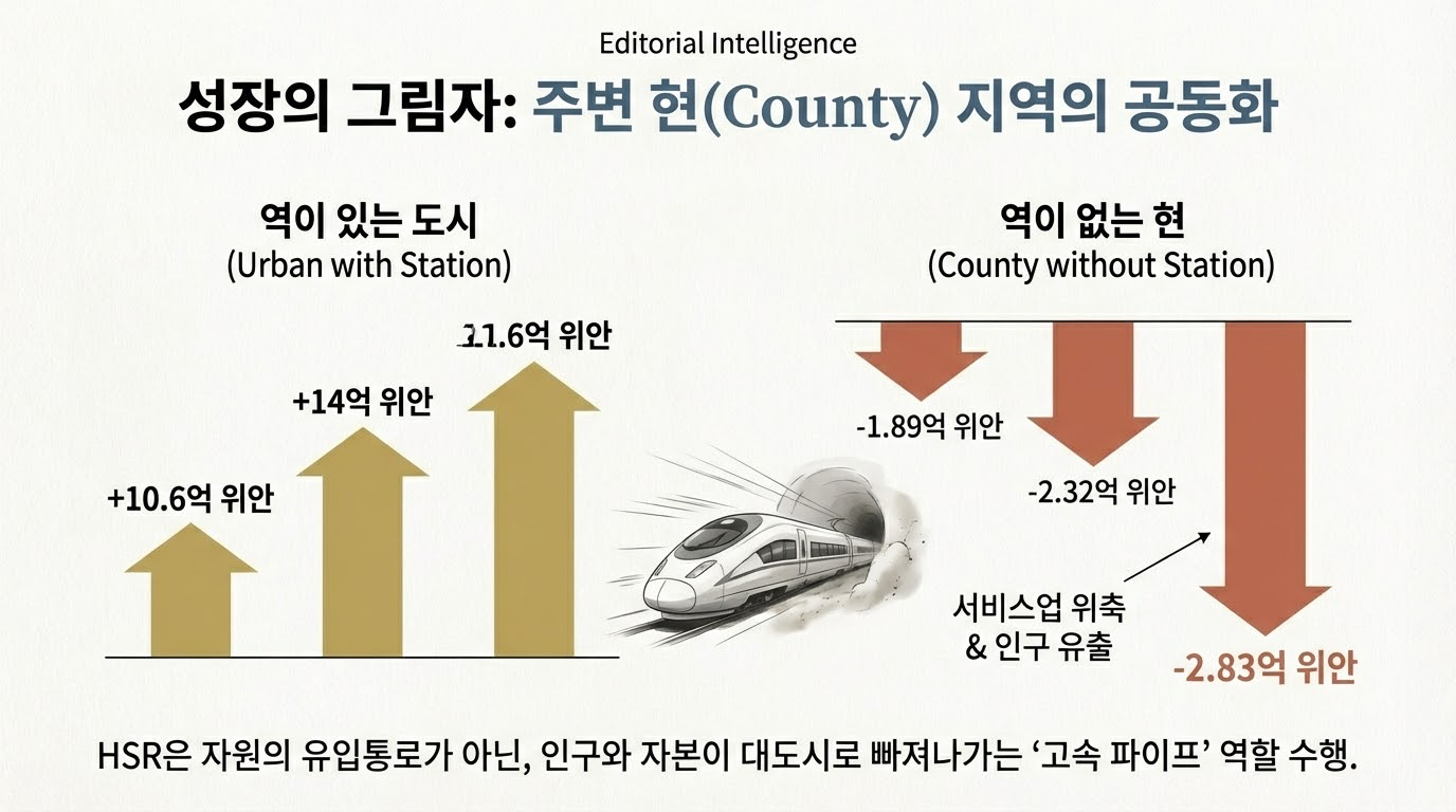 결국 고속철도는 이미 준비된 '도시 핵심부'와 '도시화된 거점'에는 기회의 날개가 되었지만, 자생력이 부족한 일반 '현' 지역에는 오히려 소외를 가속화하는 기제로 작용했습니다.