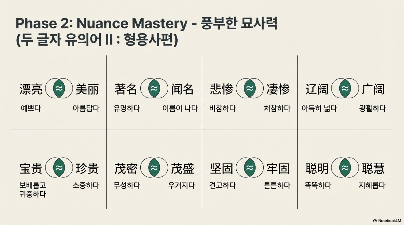 - 공통 형태소(词素) 활용법: 두 단어 사이에 공통으로 포함된 글자를 분석하여 의미의 공통분모를 찾아내는 방법입니다. 예를 들어, **'美丽(미려)'**와 **'漂亮(표량)'**에서 공통된 어감을 지닌 글자를 통해 의미적 유사성을 파악할 수 있습니다.