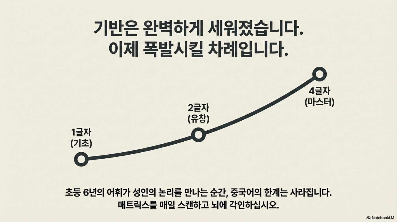 - 형태소 분석 습관화: 단어에 공통으로 들어간 글자(词素)를 통해 뜻을 유추하는 훈련을 반복하십시오. 이는 낯선 단어를 만났을 때 가장 강력한 무기가 됩니다.