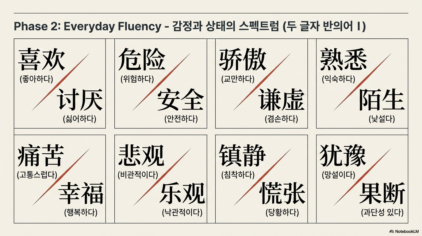 - 관용적 고도화: '경황실조(惊慌失措)-진정자약(镇定自若)', '별구일격(别具一格)-독구장심(独具匠心)' 등 의미를 압축적으로 전달하는 성어를 통해 언어 지능을 고도화합니다.