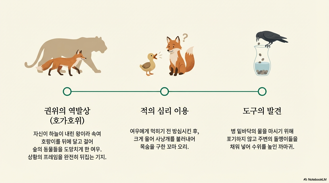 - 호가호위(狐假虎威) & 여우와 까마귀: 실체 없는 권위를 빌리거나(여우), 허영심에 휘둘려 실익을 잃는(까마귀) 사례를 통해 타인의 의도를 파악하는 '비판적 사고'의 중요성을 부각합니다.