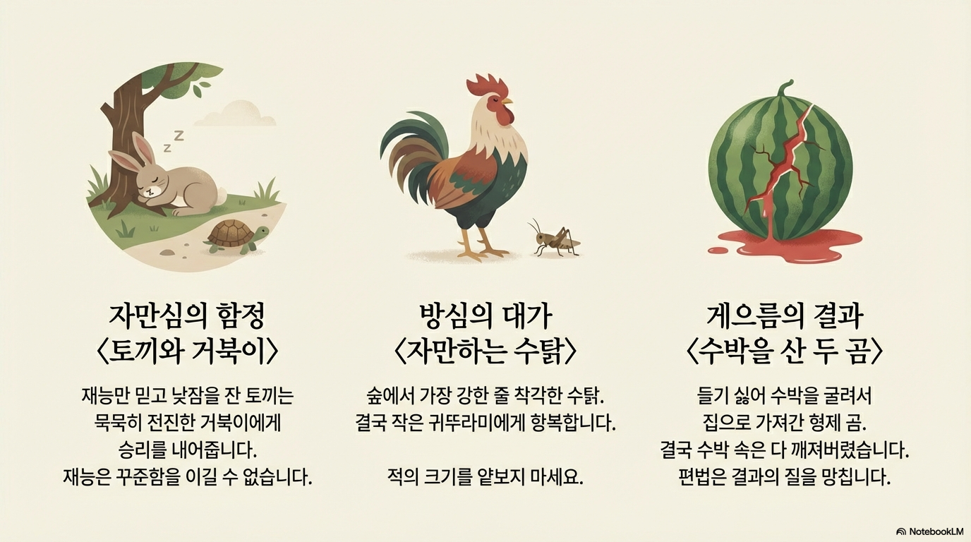 - 농부와 뱀: 뱀의 본성(공격성)과 농부의 맹목적 호의를 대조합니다. "도움을 줄 때도 상대의 본성과 상황의 원인을 먼저 파악해야 한다"는 교훈은 현대적 리스크 관리 교육과 연결됩니다.