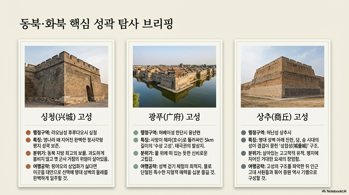 - 특수 지형의 수상 고성: **랴오청(聊城)**이나 **광푸(广府)**처럼 사방이 해자로 둘러싸여 마치 물 위에 떠 있는 듯한 신비로운 건축적 변주를 보여줍니다.