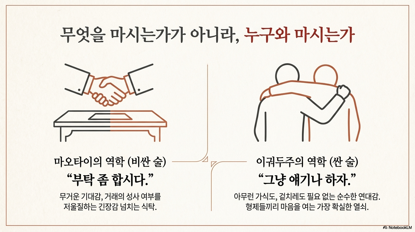 - 체면의 술: 비싼 술은 대개 부탁할 일이 있거나 격식을 차려야 할 때 마십니다. 한 잔의 가격을 계산하느라 술맛보다는 상대의 눈치를 보게 마련이죠.