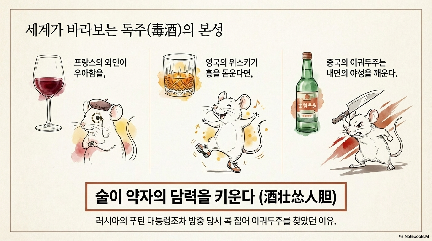 프랑스 와인을 마신 쥐는 우아하게 피아노를 연주하고, 영국 위스키를 마신 쥐는 신나게 탭댄스를 춥니다. 그런데 중국 얼궈터우를 마신 세 번째 쥐는 어떻게 했을까요? 마시자마자 주방으로 달려가 식칼을 들고 나와 기세등등하게 외칩니다. "그 고양이 새끼 어디 있어?!"