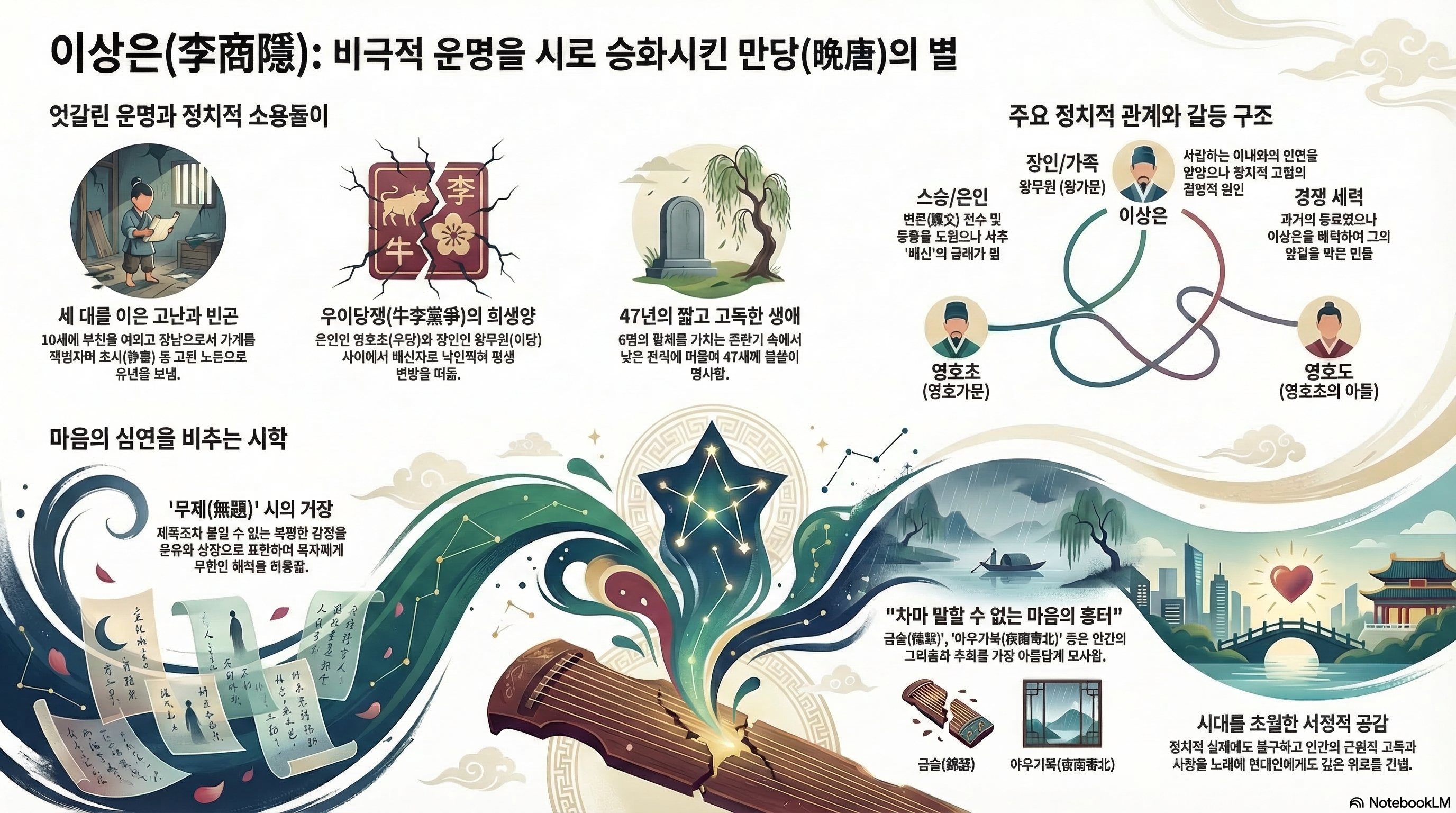 이 결혼으로 인해 그는 옛 은인의 가문(우당)에게는 ‘은혜를 모르는 배신자’로 낙인찍혔고, 새로운 처가(이당)로부터는 끝내 완전한 신뢰를 얻지 못했습니다. 양쪽 모두에게 버림받은 그는 정쟁의 한가운데 고립된 ‘가운데 낀 신세’가 되어 평생을 좌절 속에서 보내야 했습니다. 사랑하는 아내와의 관계는 마치 헤어진 연인이 서로의 생사를 확인하기 위해 반으로 쪼개 간직했다는 ‘깨진 거울(破鏡)’처럼, 온전할 수 없는 운명에 처했습니다. 사랑을 위한 선택이 결국 정치적 파멸로 이어진 이 잔인한 운명의 아이러니는 그의 시에 짙게 깔린 비극적 정서의 근원이 되었습니다. 하지만 이 모든 비극 속에서도 아내에 대한 그의 사랑은 지극했습니다. 훗날 아내와 멀리 떨어져 지내며 쓴 '야우기북(夜雨寄北)' 과 같은 시는, 정치적 고통 속에서도 변치 않았던 부부의 깊은 정을 애절하게 보여줍니다.