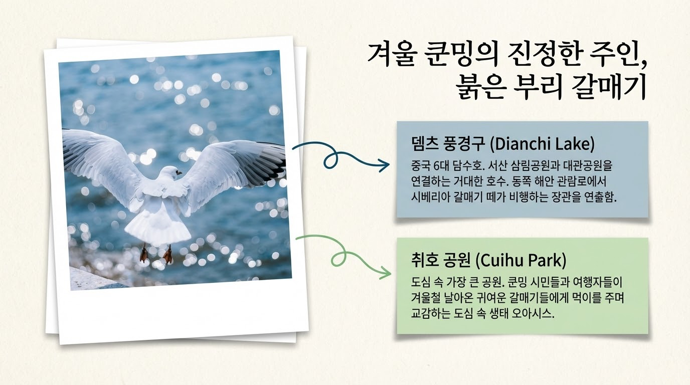 매년 겨울, 곤명의 전지(滇池)와 취호 공원(翠湖公园)은 시베리아에서 날아온 수만 마리의 붉은부리갈매기 떼로 장관을 이룹니다. 해발 약 1,900m의 고원 도시 한복판에서 바다의 전유물이라 생각했던 갈매기를 만나는 경험은 그 자체로 이색적입니다. 이는 단순히 우연한 자연현상이 아니라, 도시의 맑은 공기와 풍부한 수자원이 시베리아의 생명체와 맺은 일종의 '생태적 약속'입니다.