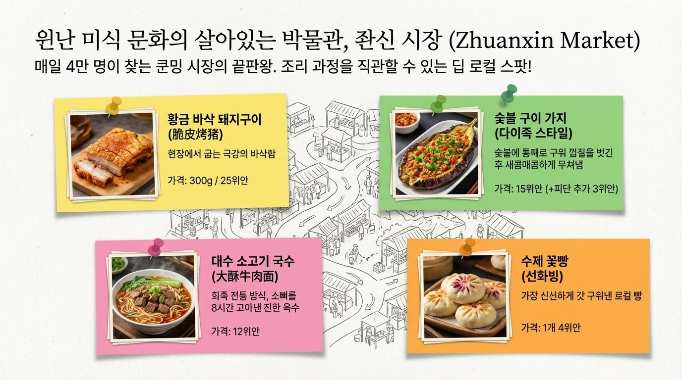 최근의 여행 트렌드인 '마켓 투어리즘(Market Tourism)'을 가장 완벽하게 경험할 수 있는 곳이 바로 '전신(zhuanxin) 시장'입니다. 25개 소수민족의 식문화가 융합된 이곳은 단순한 식재료 판매처를 넘어 '로컬리즘이 극대화된 인류학적 플랫폼'입니다.